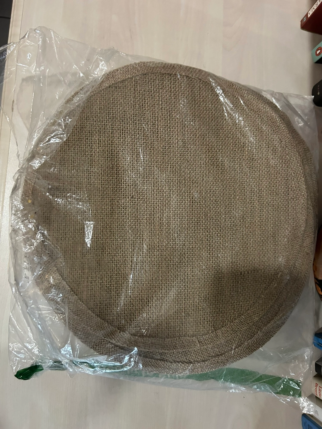 Selling brand new round burlap placemats, still in their original packaging! They're perfect for adding a rustic touch to your dining table.