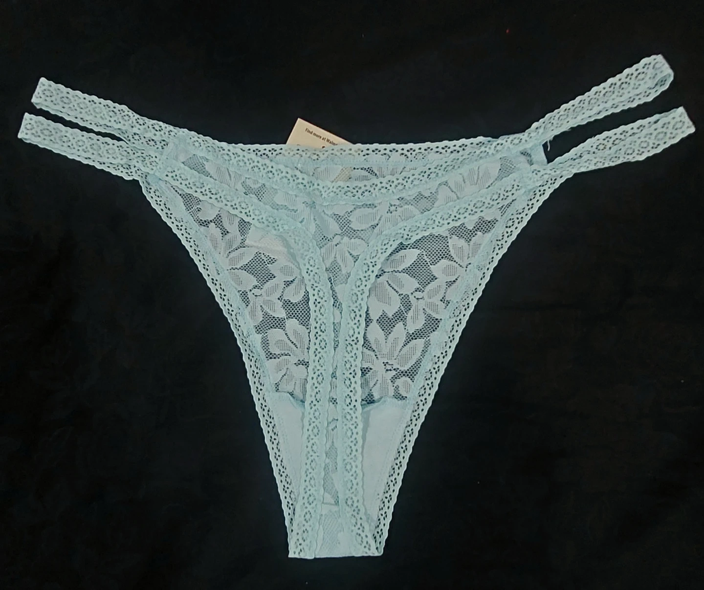 Light blue lace thong underwear. Features strappy detailing on the sides and lace trim. Made with a blend of nylon and spandex for comfort.