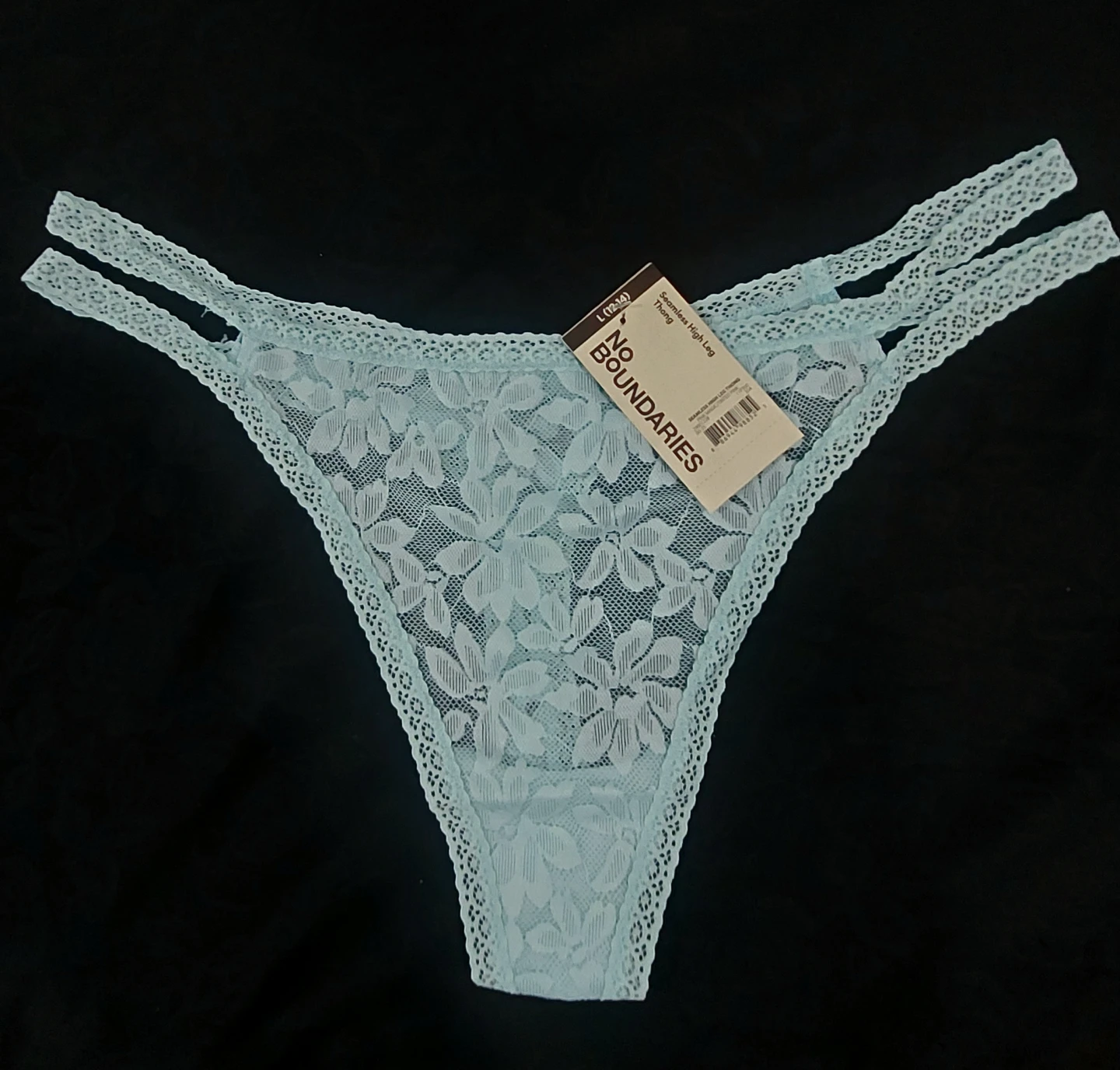 Light blue lace thong underwear. Features strappy detailing on the sides and lace trim. Made with a blend of nylon and spandex for comfort.