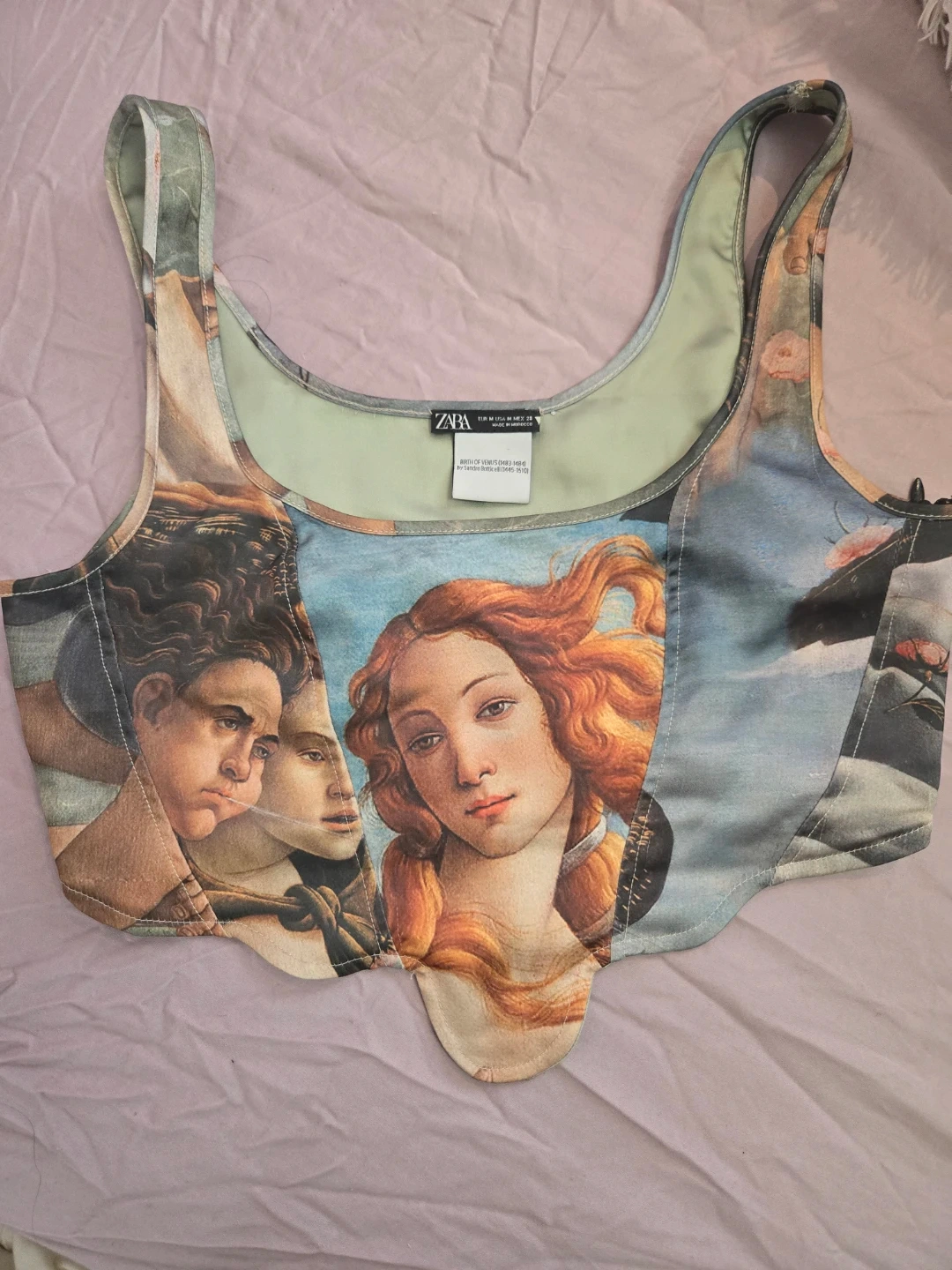 Here's a Zara corset top featuring the iconic "Birth of Venus" artwork! It's a size M and in great condition. Perfect for adding a touch of art to your wardrobe
