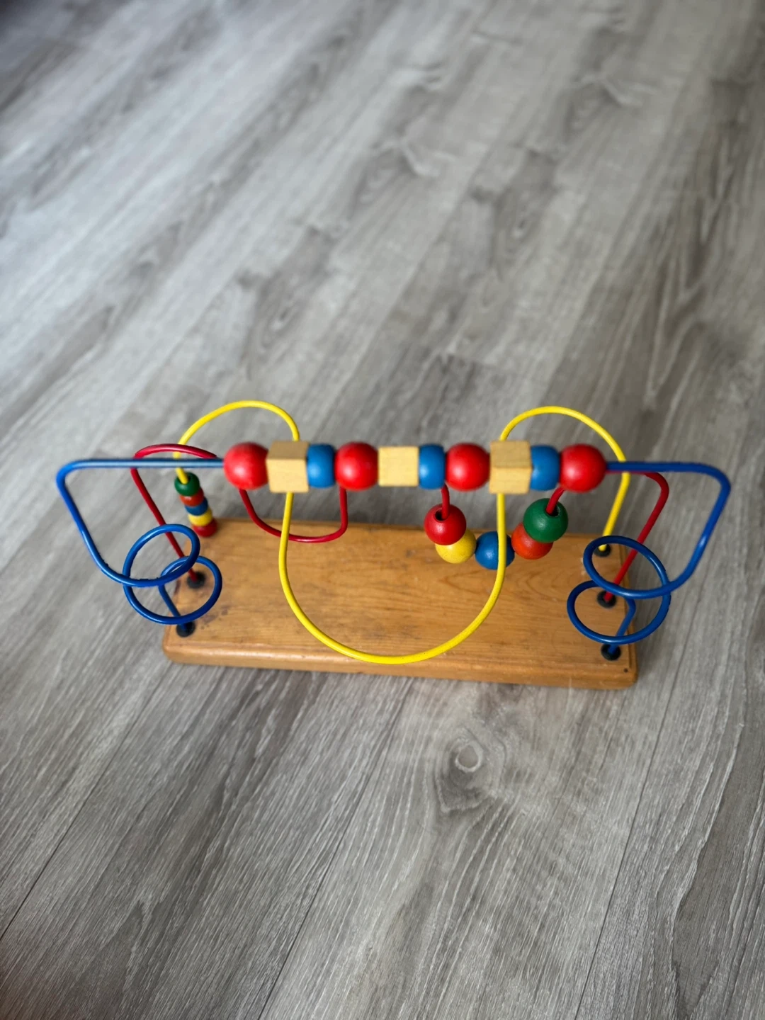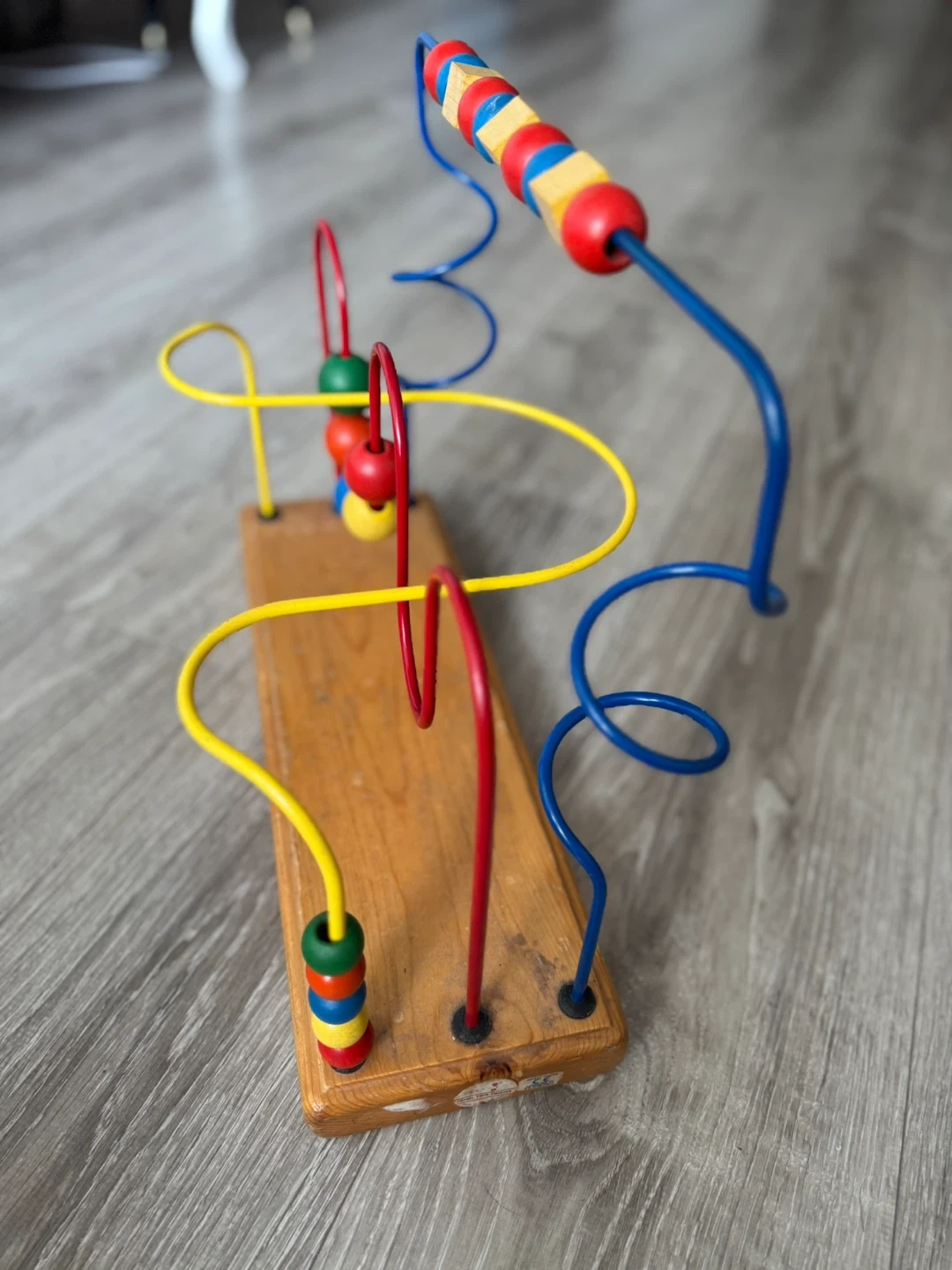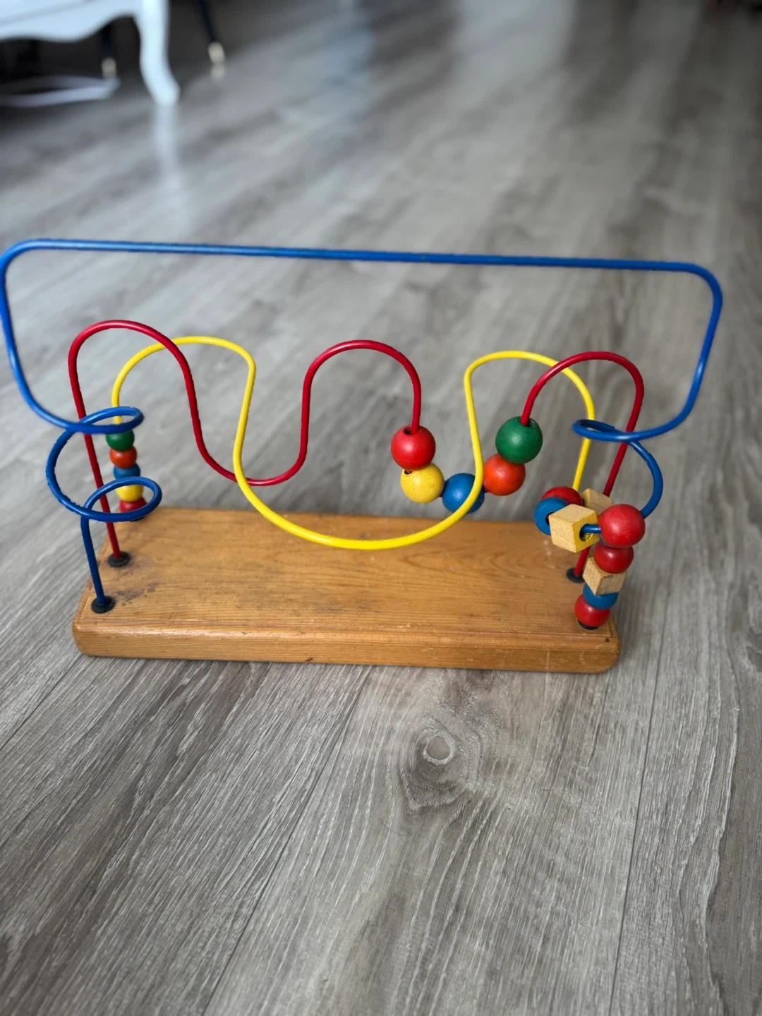 This is a wooden bead maze toy with colourful wires and beads. It features a sturdy wooden base and metal wires. This toy's excellent for developing fine motor skills and hand-eye coordination in little ones!