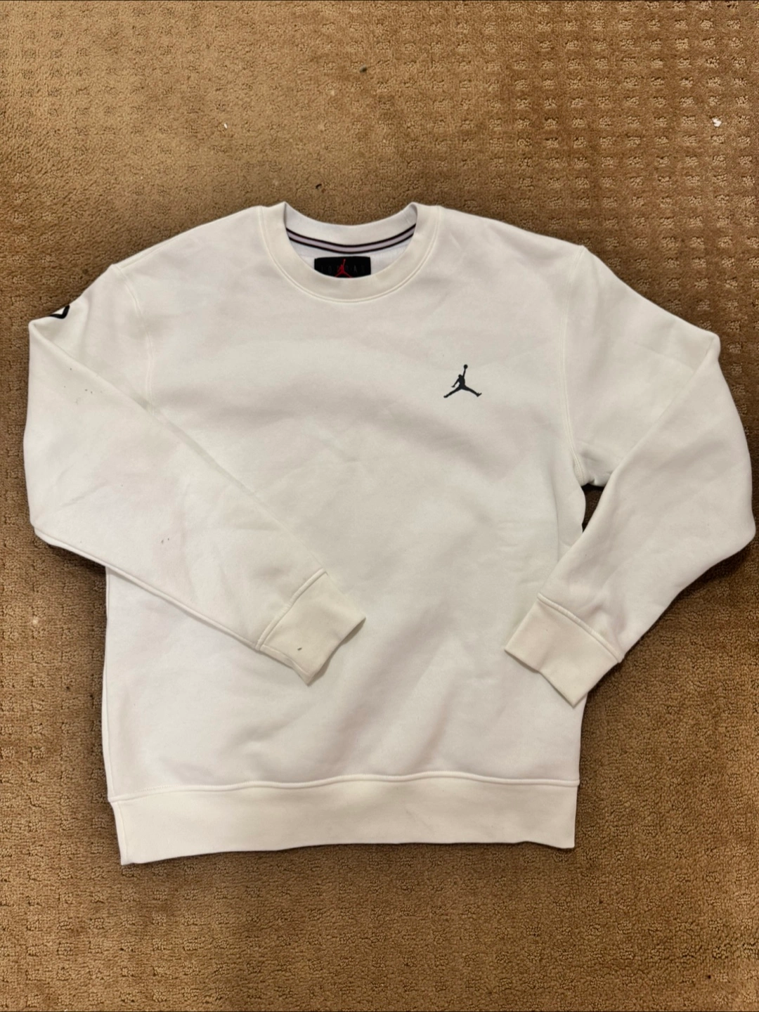 Men's off-white Jordan crewneck sweatshirt. Features a Jumpman logo on the chest and large 'JORDAN' lettering on the back. Long sleeves, comfortable cotton material. It’s fits large.