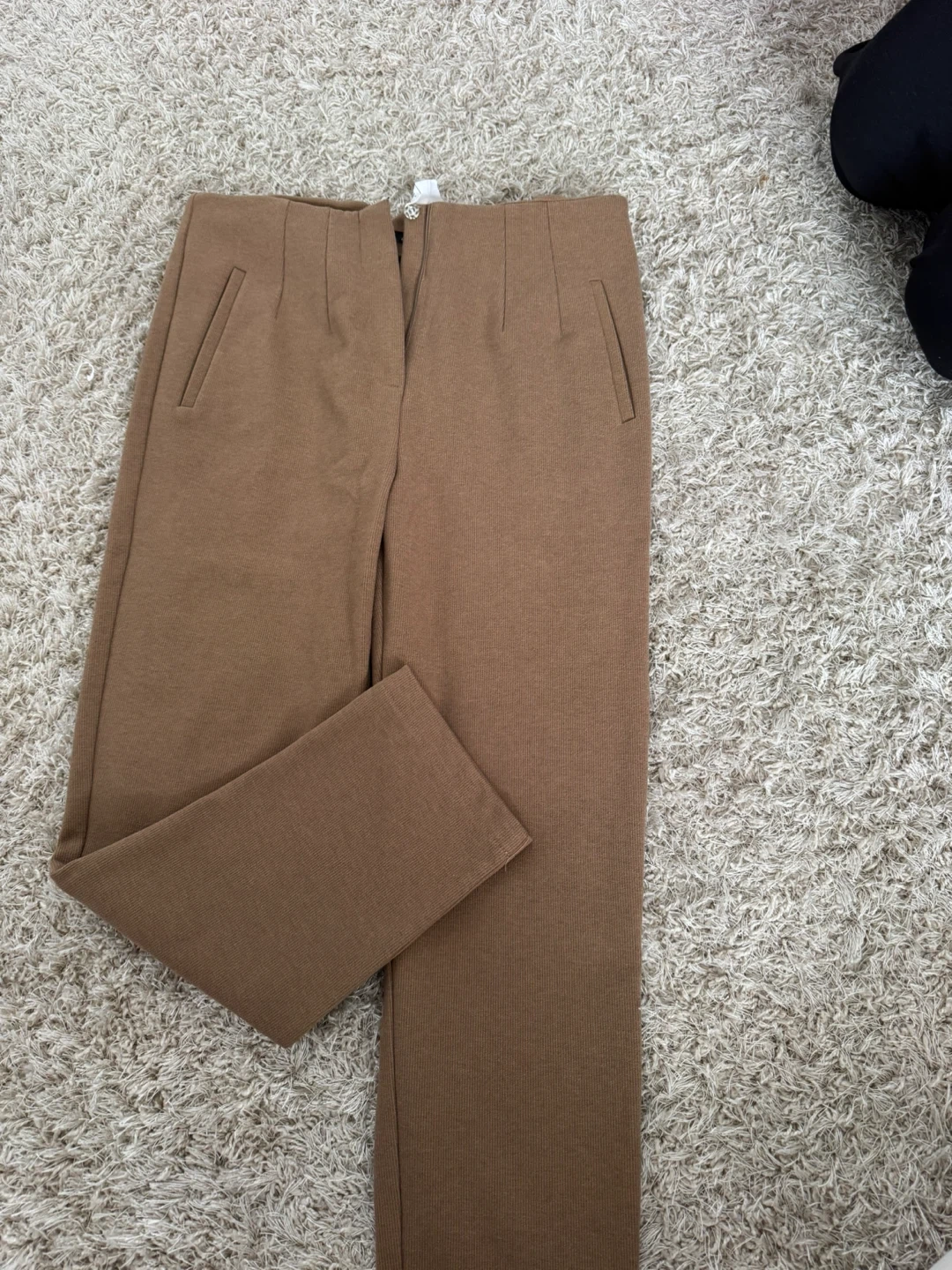 These are ON THE GO camel-coloured pants. Size L. They're made with a textured fabric and feature a zip fly and button closure.