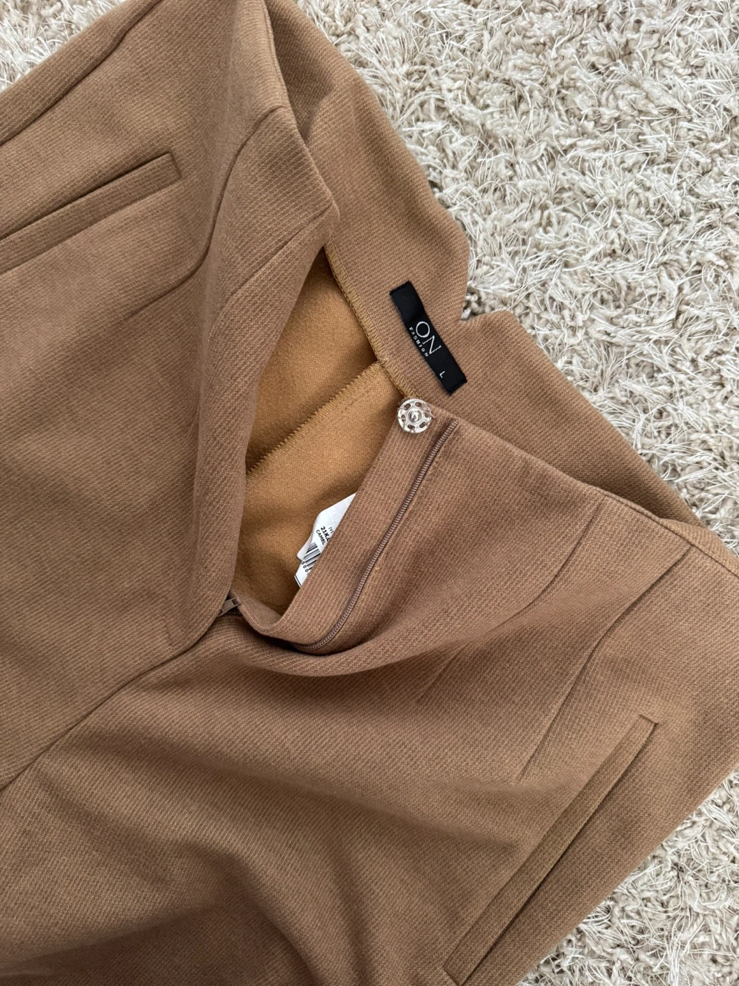 These are ON THE GO camel-coloured pants. Size L. They're made with a textured fabric and feature a zip fly and button closure.