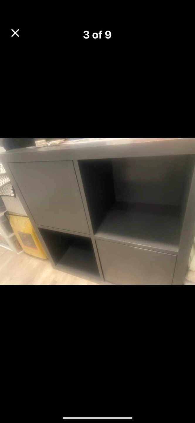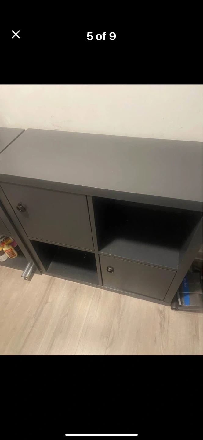 This grey cube storage unit has a versatile design with two open shelves and two enclosed cabinets. Each cabinet has a black ring pull handle for easy access. It's great for organizing books, toys, or other household items. The unit offers a clean look that fits in most rooms.