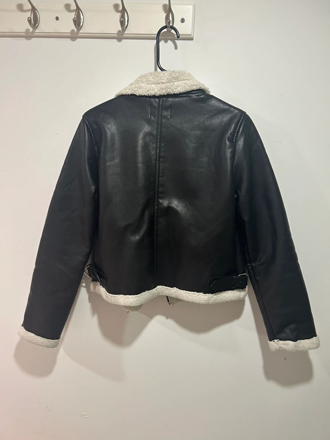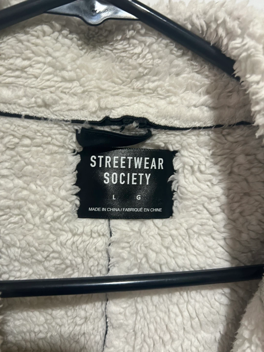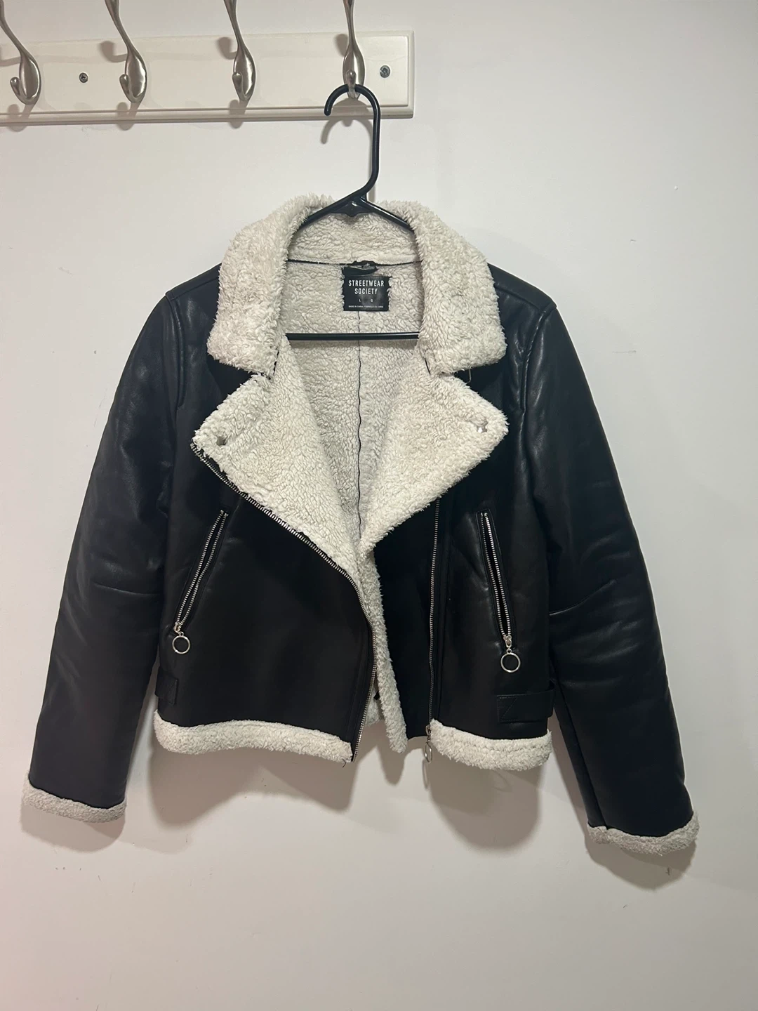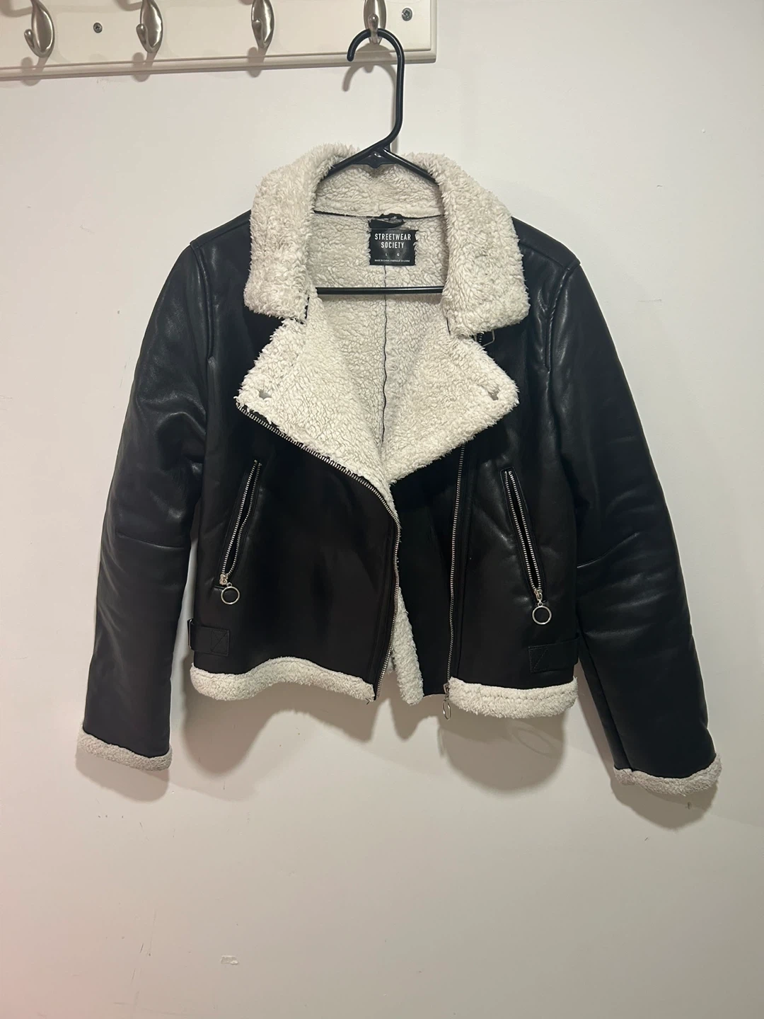 Cozy up in this Streetwear Society faux leather jacket! It features a soft, white colour shearling lining and trim, giving it a stylish and warm look. It's a size large and in great condition!