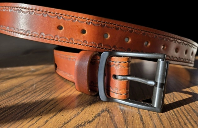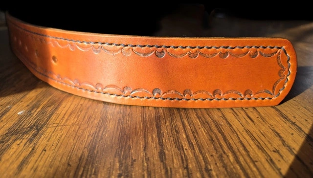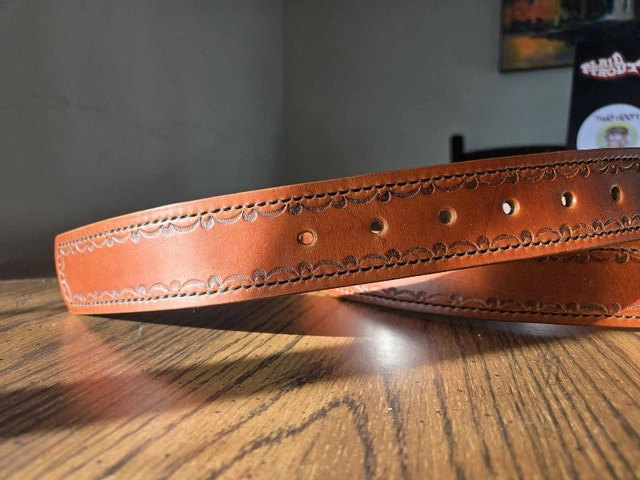 Custom hand-made belts using some of the best full grain veg tanned leather (Hermann Oak). Multiple dyes, colored threads, and hardware options available. Each belt is meticulously made by hand, from cutting and hole punching to dying and stitching. These are 1.5" wide, made with 9 to 10 oz leather (approx. 4 mm thick) and come in various lengths with adjustable hole placement. Options range from plain and simple to border stamping or full tooling. Prices vary based on the level of work and detail. Most buckles are attached with chicago screws, allowing you to switch them out, or they can be permanently fastened with copper rivets. All edges are burnished for a clean look, and the flesh side is smoothed. The top is coated with a natural beeswax for dye protection and water repellency. A basic 1.5" belt with choice of color and buckle (not stitched) is $150. A stitched and border stamped belt is $250. Additional tooling is extra depending on complexity. I also make slings, wallets, sheaths, buttstock covers, lighter cases, and more. Feel free to ask for a quote or if you have any questions!