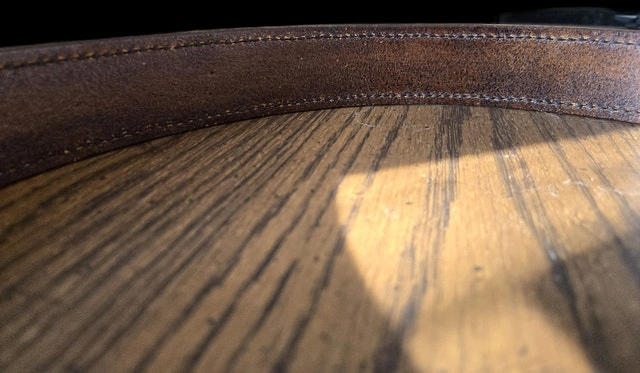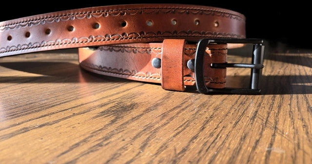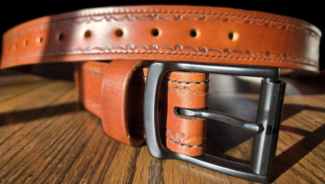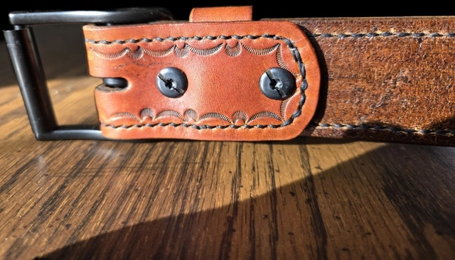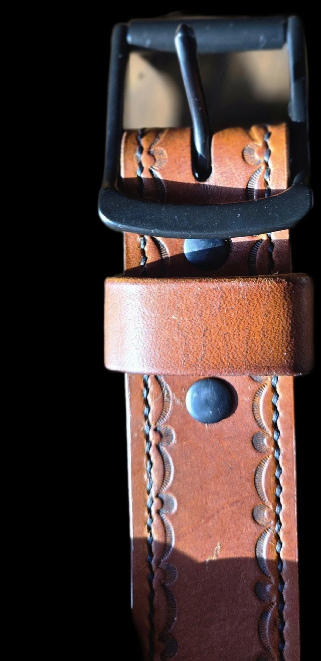 Custom hand-made belts using some of the best full grain veg tanned leather (Hermann Oak). Multiple dyes, colored threads, and hardware options available. Each belt is meticulously made by hand, from cutting and hole punching to dying and stitching. These are 1.5" wide, made with 9 to 10 oz leather (approx. 4 mm thick) and come in various lengths with adjustable hole placement. Options range from plain and simple to border stamping or full tooling. Prices vary based on the level of work and detail. Most buckles are attached with chicago screws, allowing you to switch them out, or they can be permanently fastened with copper rivets. All edges are burnished for a clean look, and the flesh side is smoothed. The top is coated with a natural beeswax for dye protection and water repellency. A basic 1.5" belt with choice of color and buckle (not stitched) is $150. A stitched and border stamped belt is $250. Additional tooling is extra depending on complexity. I also make slings, wallets, sheaths, buttstock covers, lighter cases, and more. Feel free to ask for a quote or if you have any questions!