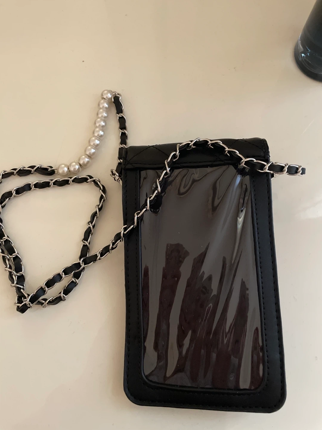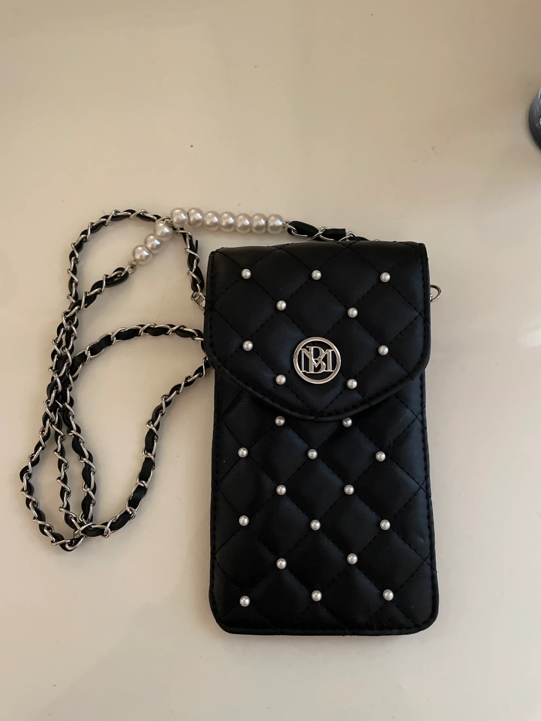 Bagley Mishka Quilted black phone bag with a clear window on the back. It's adorned with faux pearls and has a detachable chain and pearl shoulder strap. Perfect for carrying your phone and essentials hands-free!