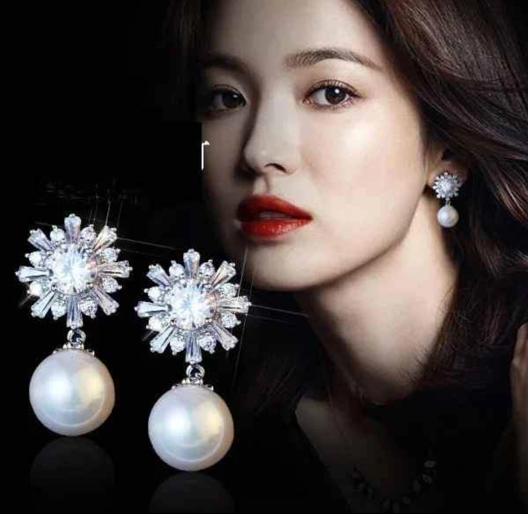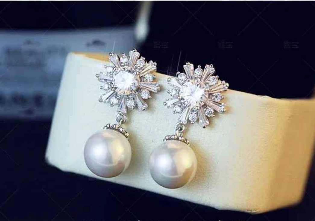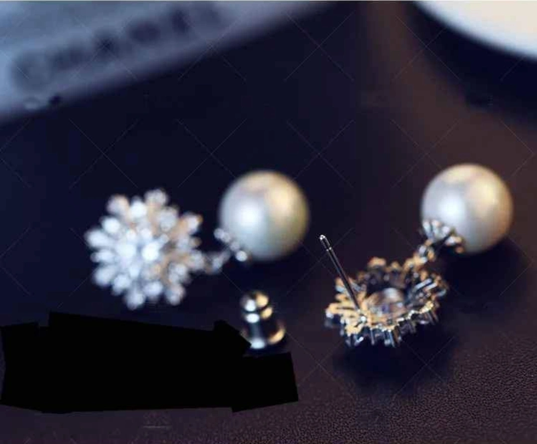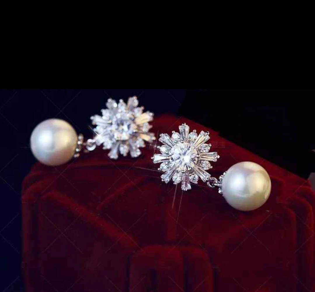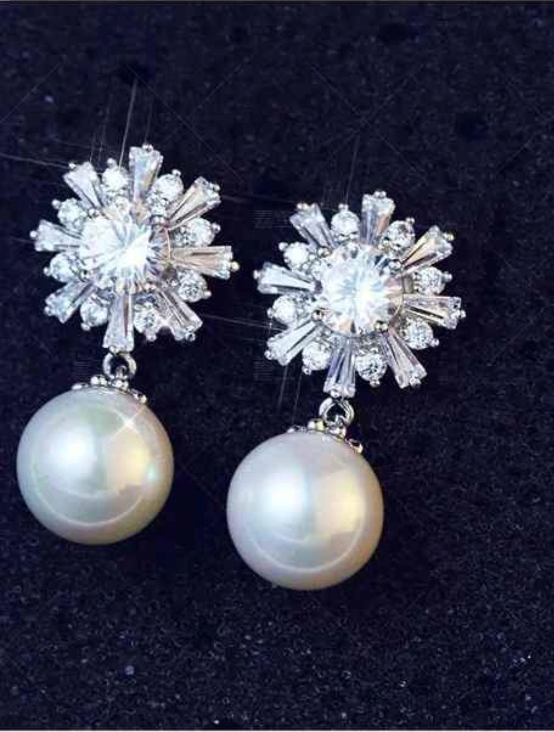 Elegant earrings with snowflake design and pearl drop. Silver toned with clear cubic zirconia stones. Stunning bright rectangular crystal stones pearl drop earrings