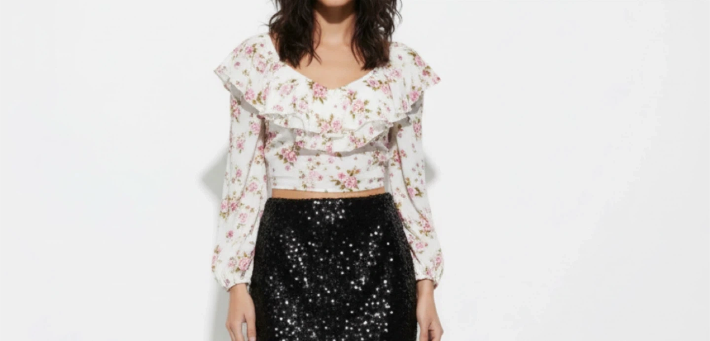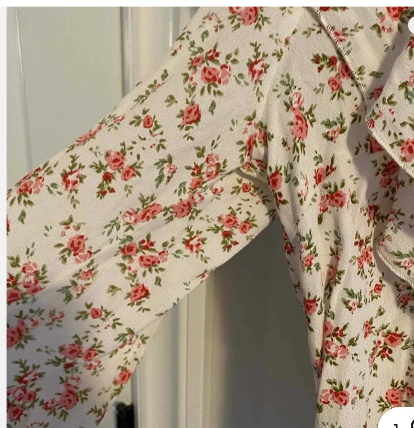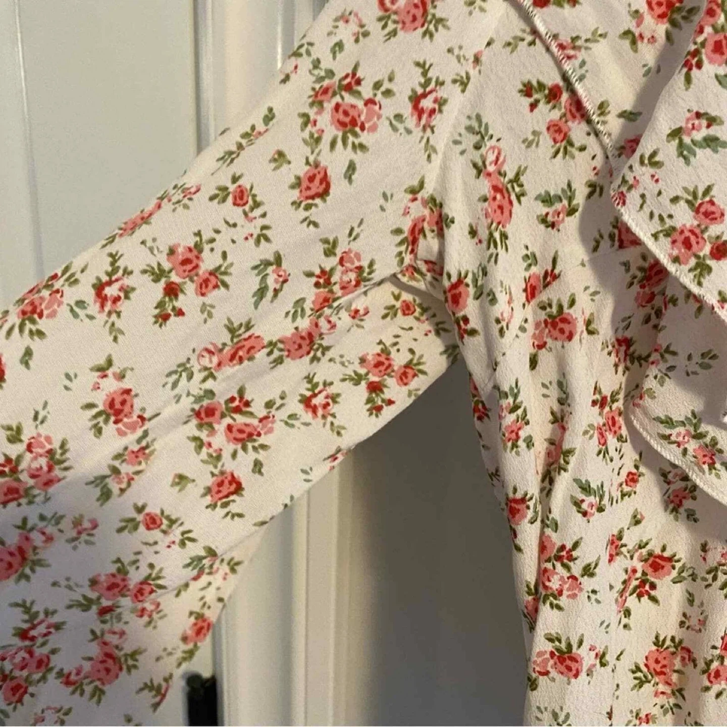 This is a lovely cropped top with a white base and a white, pink, and green floral print. It's made of rayon and features a ruffled neckline and long sleeves. Size is small.