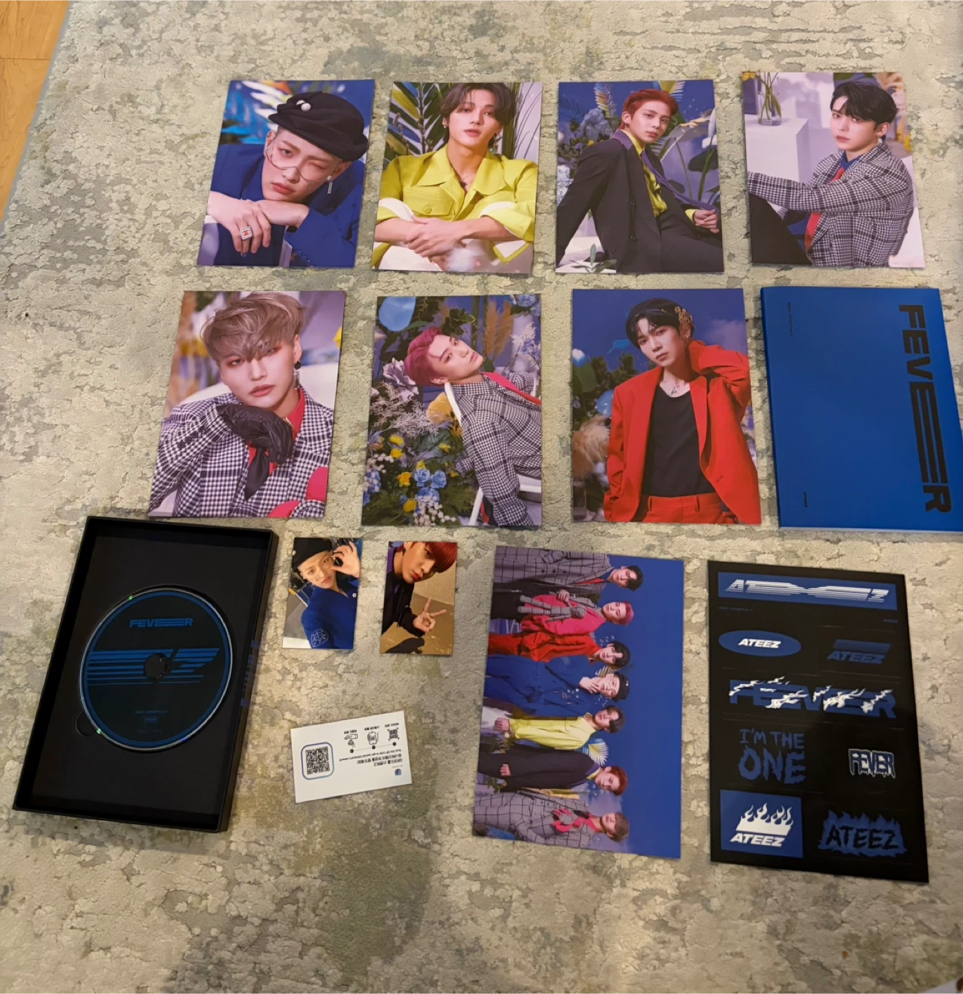 This is the "FEVER" Part. 2 album from ATEEZ. It includes a photobook, CD, and various photo cards and stickers.