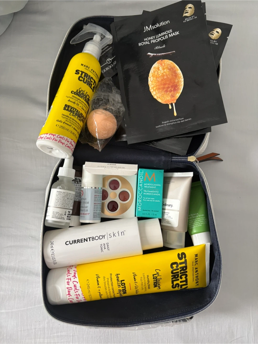 Includes JM Solution Royal Propolis Masks and Marc Anthony Strictly Curls products. Also features skincare items from Currentbody Skin, The Ordinary, and Origins. A makeup sponge and Jo Malone sample are also present. Great for a varied beauty routine!