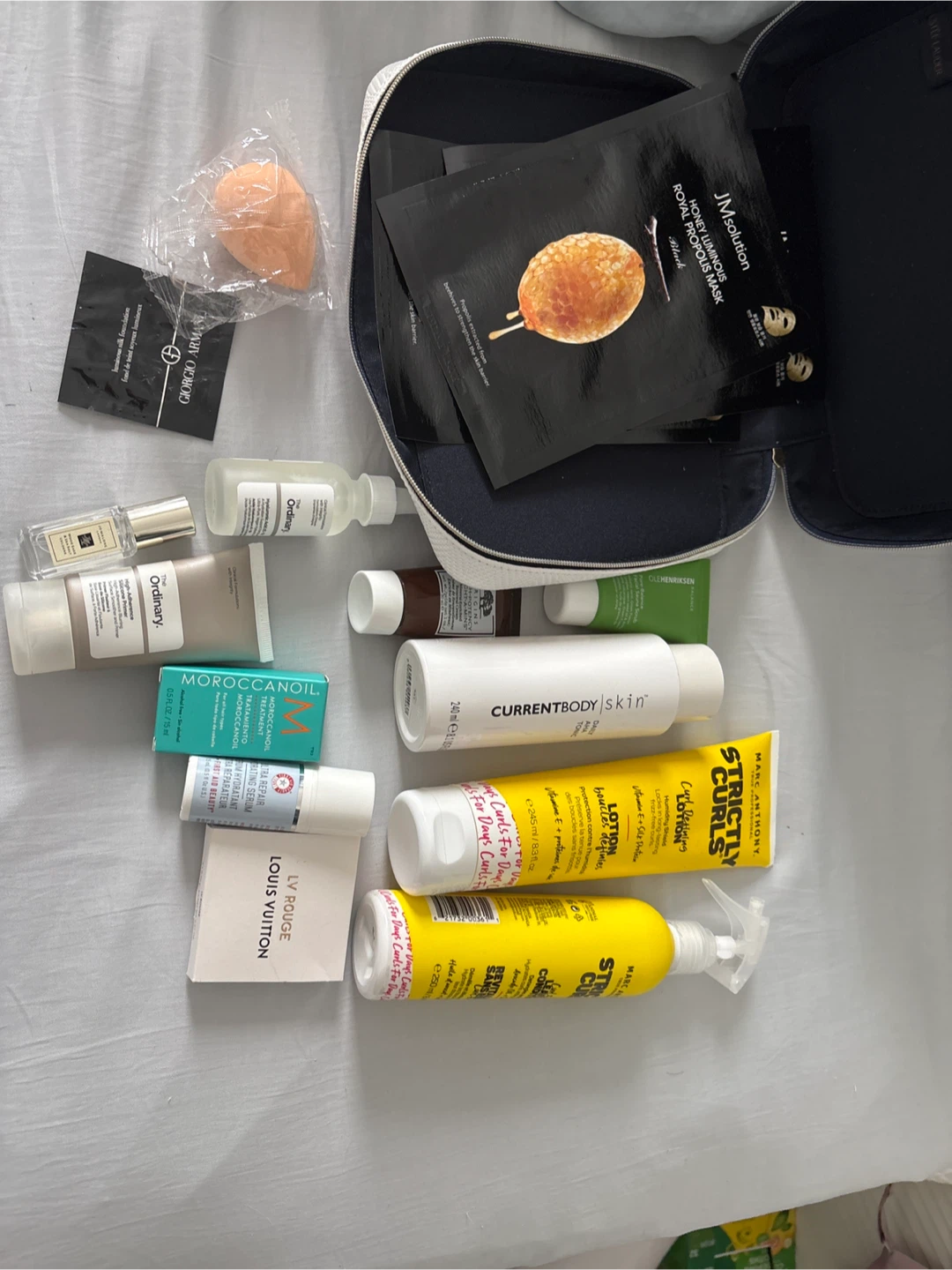 Includes JM Solution Royal Propolis Masks and Marc Anthony Strictly Curls products. Also features skincare items from Currentbody Skin, The Ordinary, and Origins. A makeup sponge and Jo Malone sample are also present. Great for a varied beauty routine!