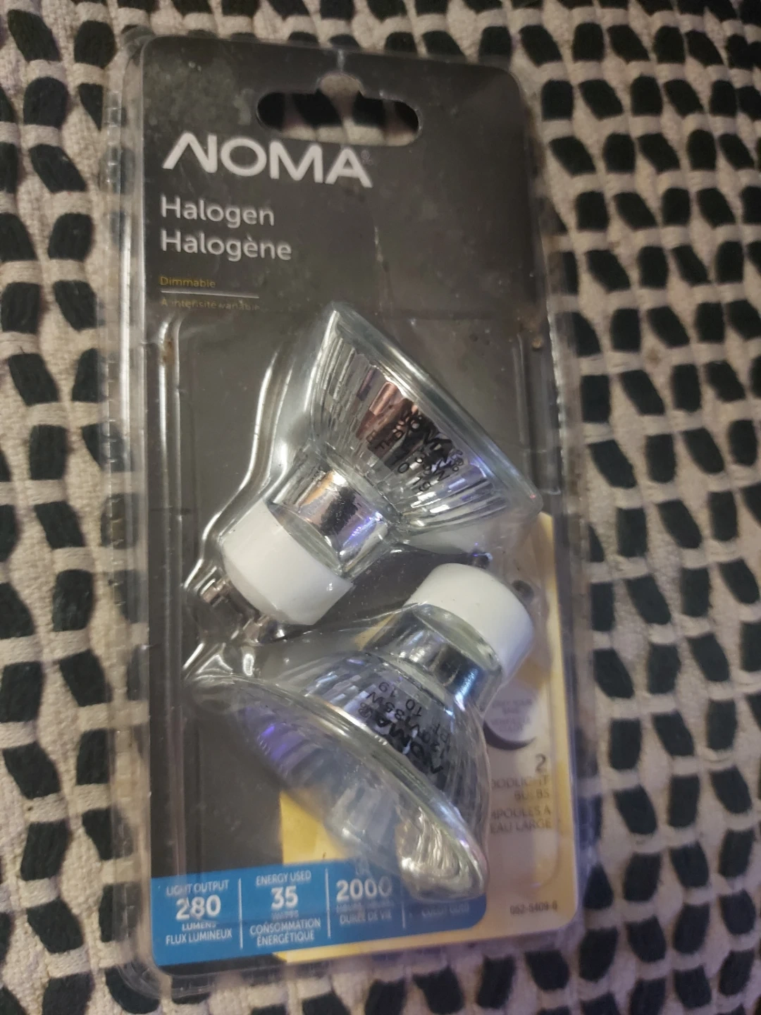 Selling a new package of NOMA halogen light bulbs. These are dimmable and have a light output of 280 lumens. They use 35 watts of energy and have a lifespan of 2000 hours. The package includes 2 bulbs.