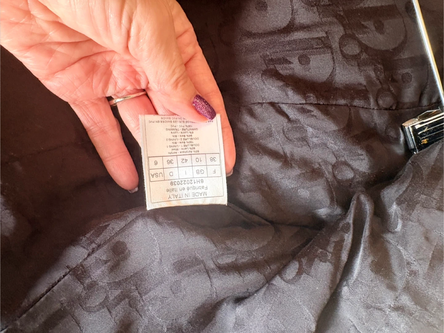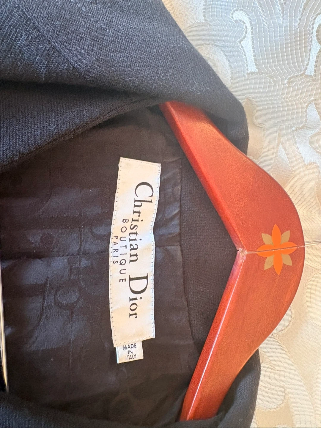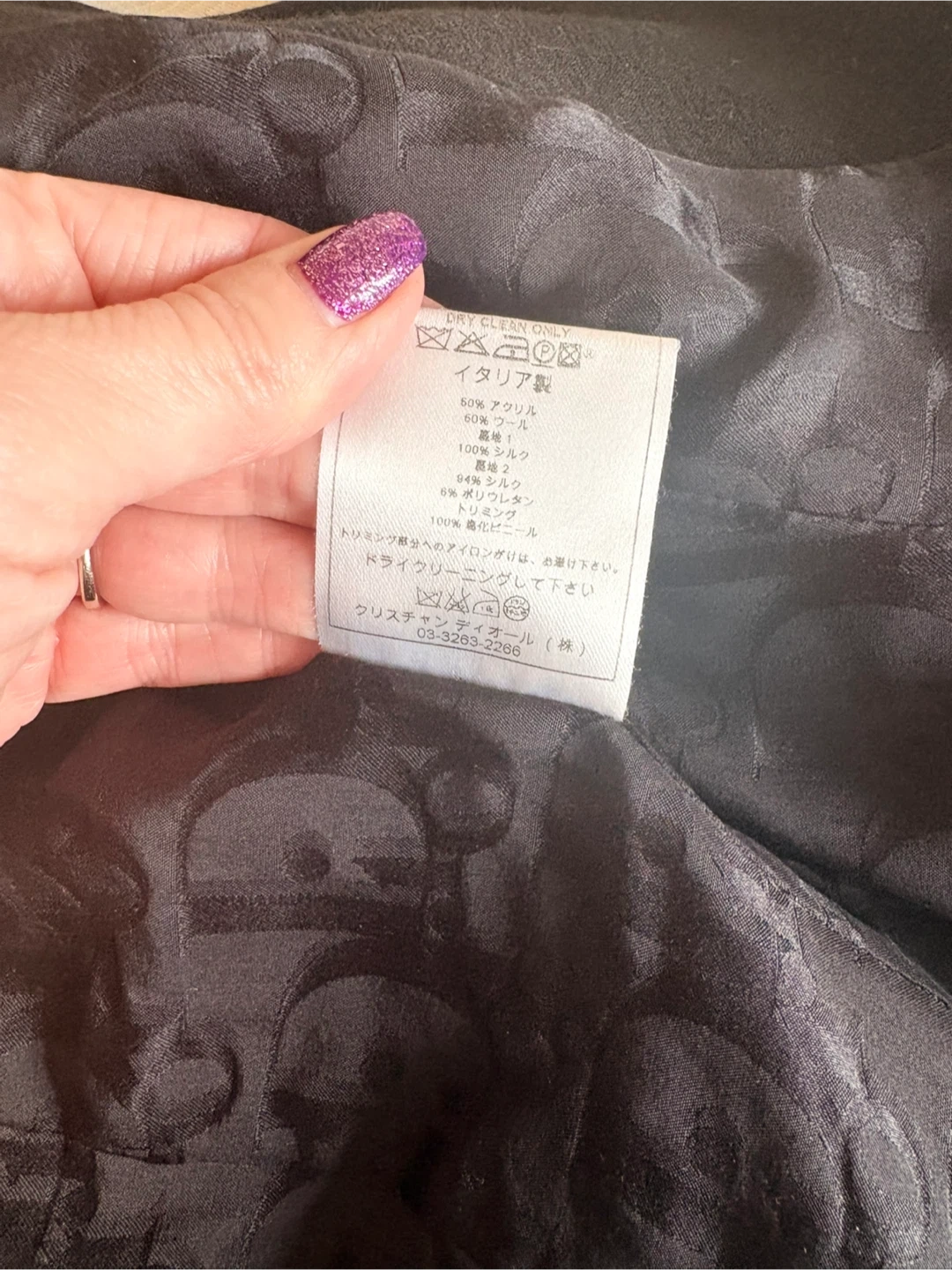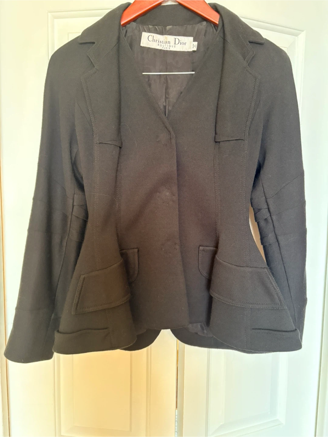 This Christian Dior jacket has a structured silhouette with distinct flair at the waist, discreet snap closures and interesting details on the back and sleeves. This jet black blazer turns heads whether dressed up or down.