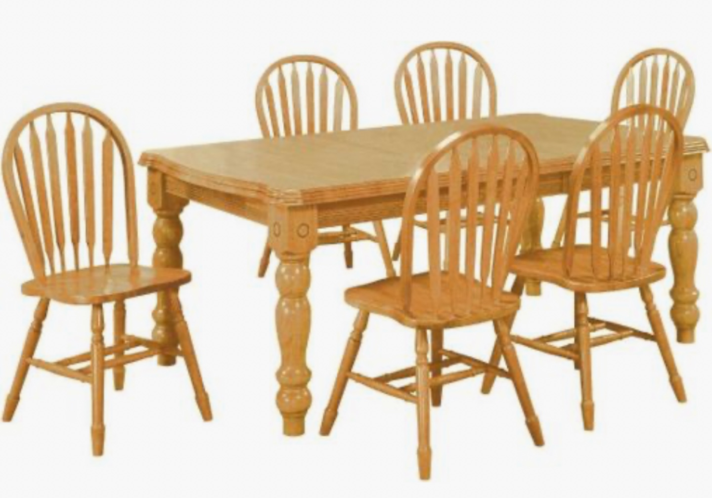 The set features a rectangular table and six matching chairs, all crafted from wood. The chairs have arched backs and spindle detailing, with the table having ornate legs. This dining set would create the perfect atmosphere for your family gatherings, allowing for many wonderful memories to be made.