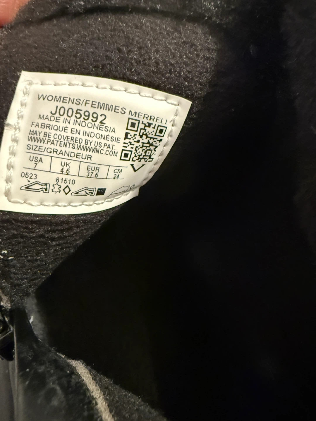 Selling a pair of Merrell women's winter boots, model J005992, in a size 7 US. These boots are perfect for keeping your feet warm and dry during the colder months. They feature a stylish design with a black leather upper and a herringbone patterned fabric around the ankle. They are in very good condition for lots of use! I can bring them for you to try only. No commitment to buying is necessary!