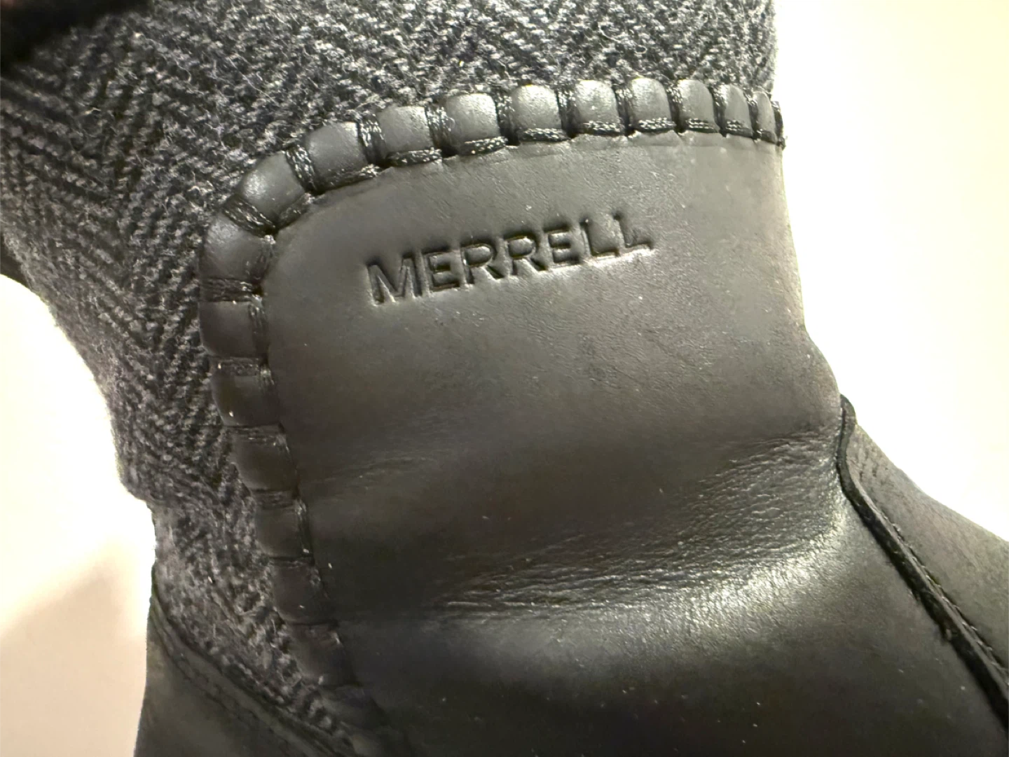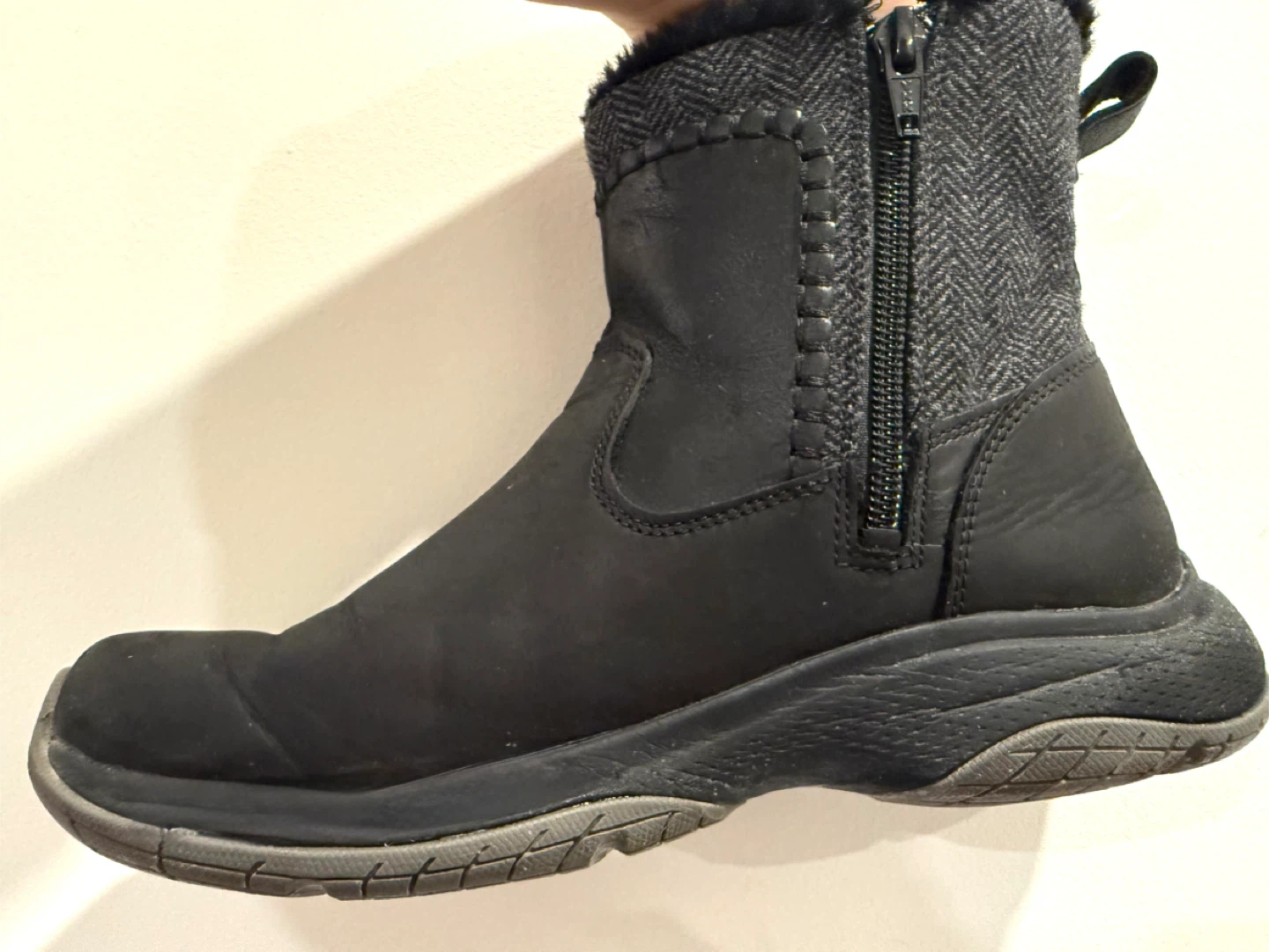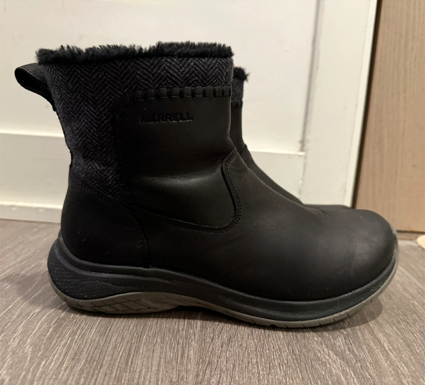 Selling a pair of Merrell women's winter boots, model J005992, in a size 7 US. These boots are perfect for keeping your feet warm and dry during the colder months. They feature a stylish design with a black leather upper and a herringbone patterned fabric around the ankle. They are in very good condition for lots of use! I can bring them for you to try only. No commitment to buying is necessary!