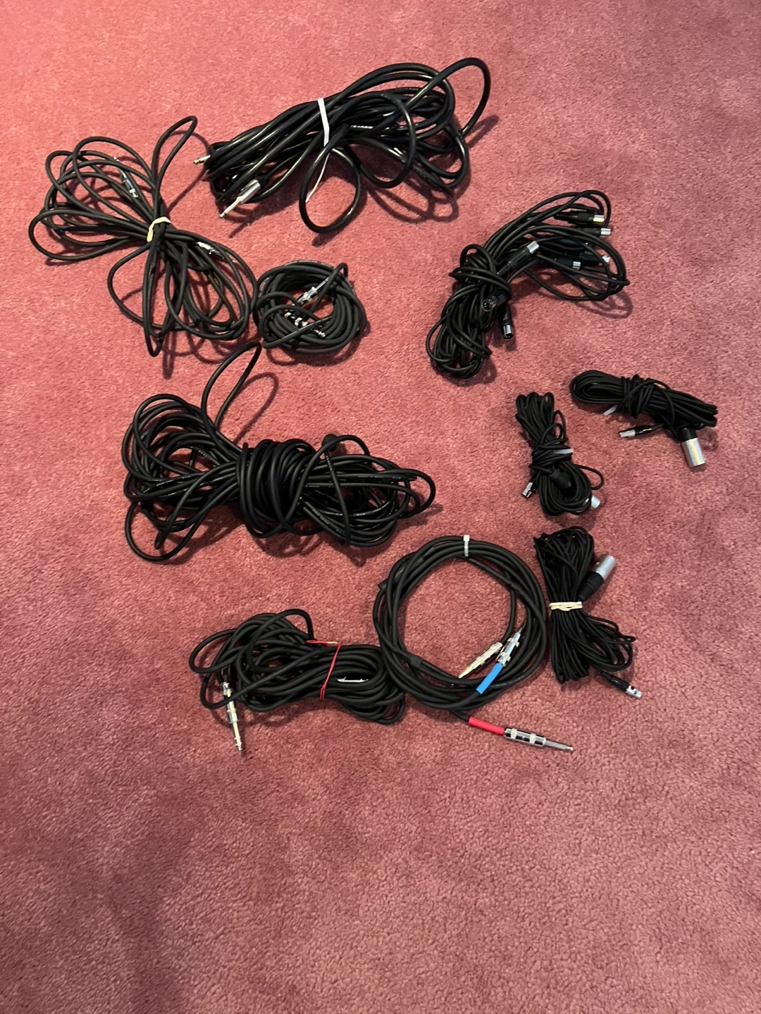 Bundle of black audio cables. Includes various lengths and connector types. Mostly Rapco Horizon branded, low noise, balanced microphone cables. All cables are in good condition and ready for use!