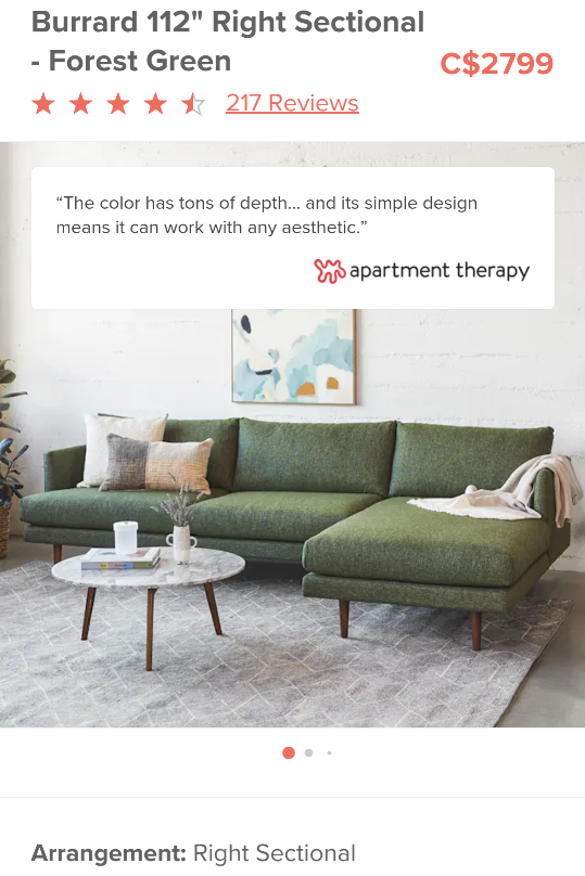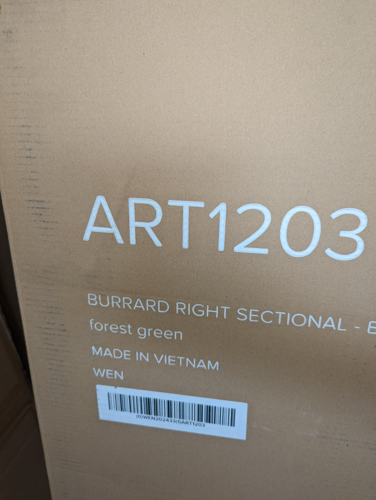 NEW partial half size new in box Selling a Burrard Right Sectional in a lovely forest green colour! It's a right sectional arrangement. The original price was $2799. The simple design means it can work with any aesthetic