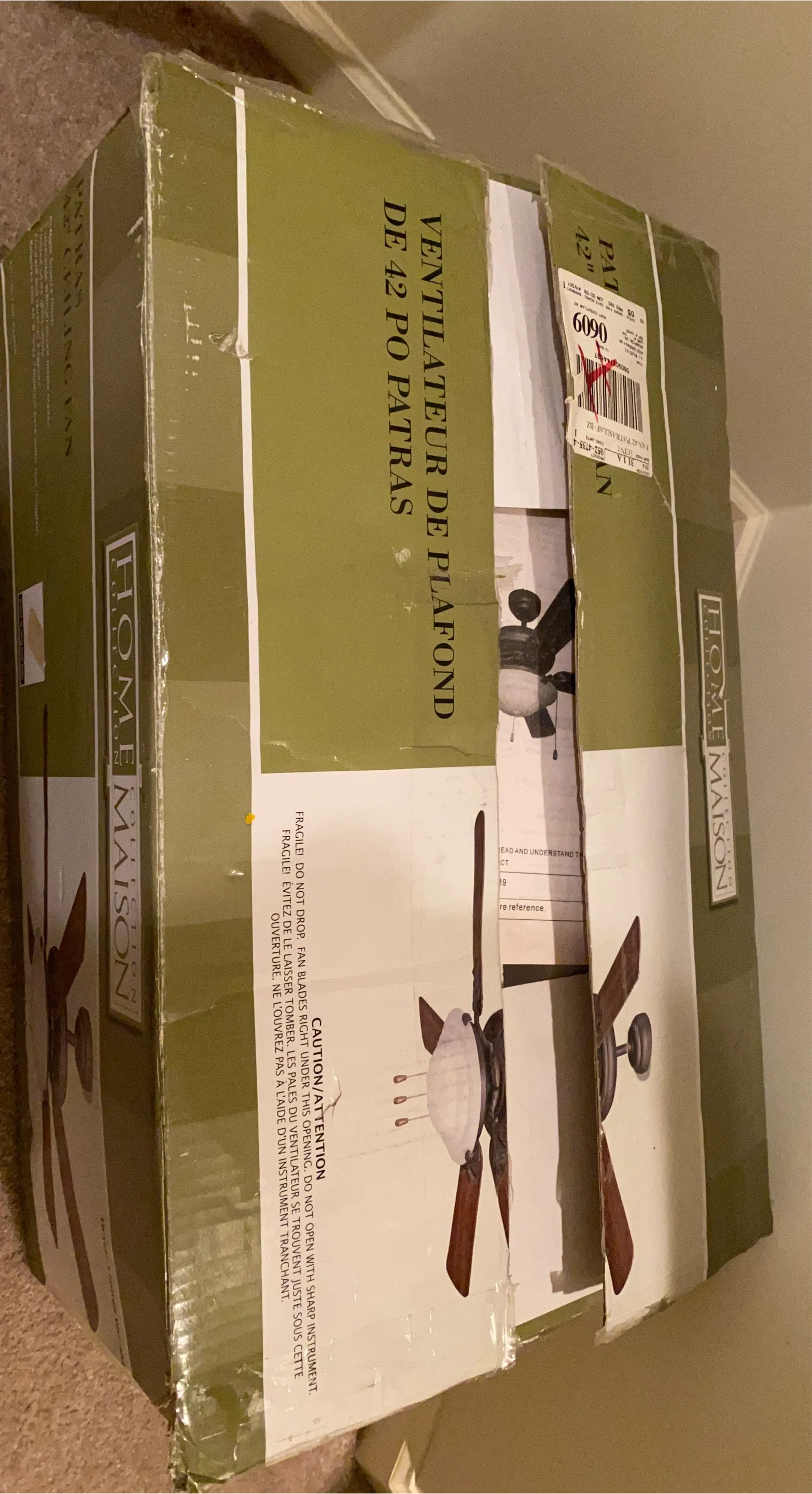 This is a Home Maison Patras ceiling fan. It's a 42-inch model. Includes all necessary components for installation. Unused, new still in box