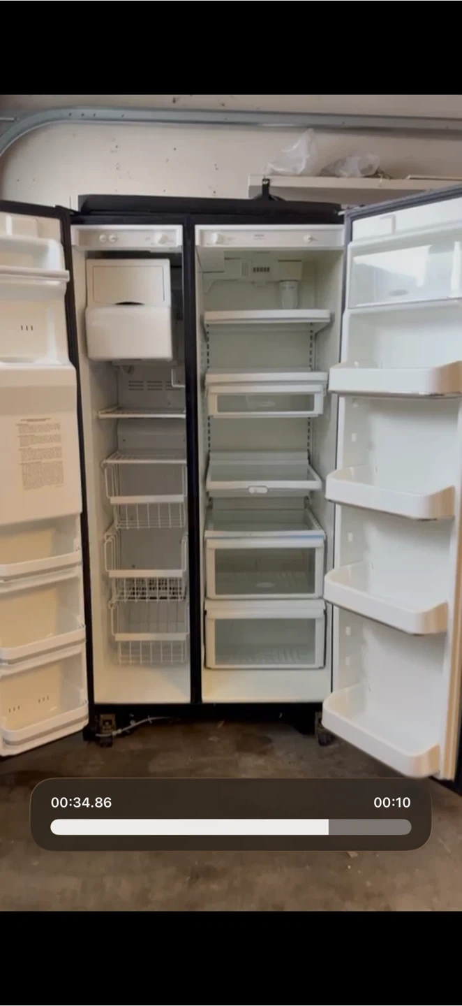This is a stainless steel side-by-side refrigerator from KitchenAid. It features an external ice and water dispenser. The unit is in good condition.