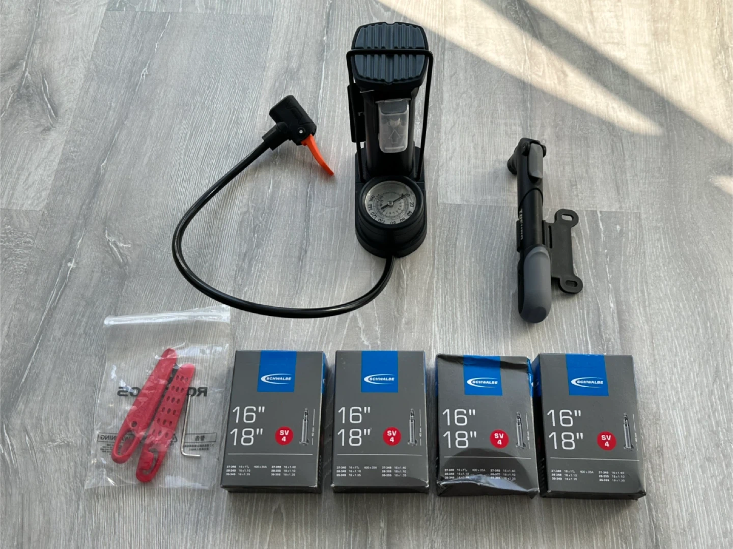 This set includes four Schwalbe 16"/18" SV4 inner tubes. Also comes with a floor pump with a gauge and a portable mini pump. Includes a pair of tire levers.