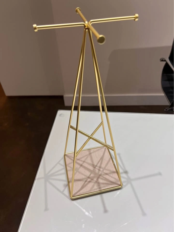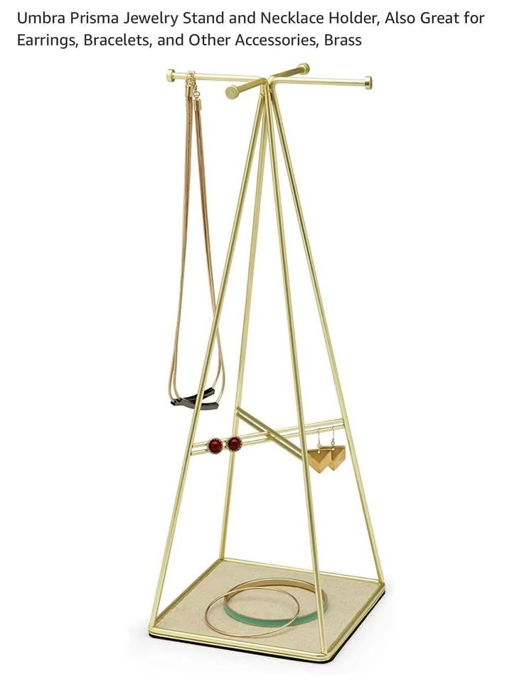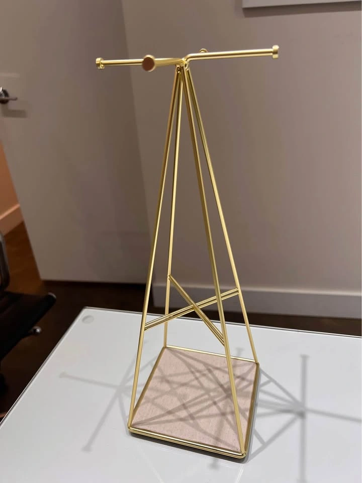 Elegant jewelry stand with a small footprint. Beautiful metallic gold finish. Great for organizing necklaces, earrings, rings and bracelets. Extra storage space at the bottom.