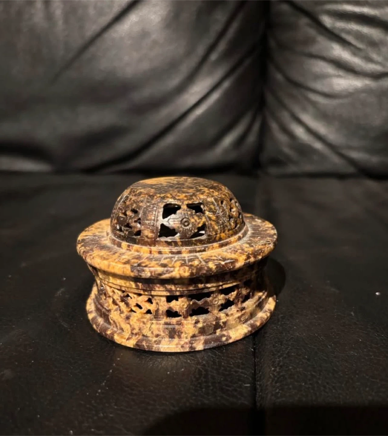 This is a carved stone incense burner with intricate cutouts. It's made from natural stone with a marbled brown and yellow pattern. This burner is ideal for holding incense sticks or cones.