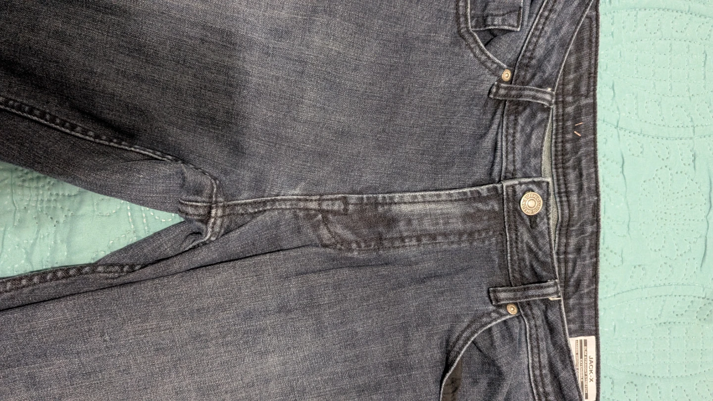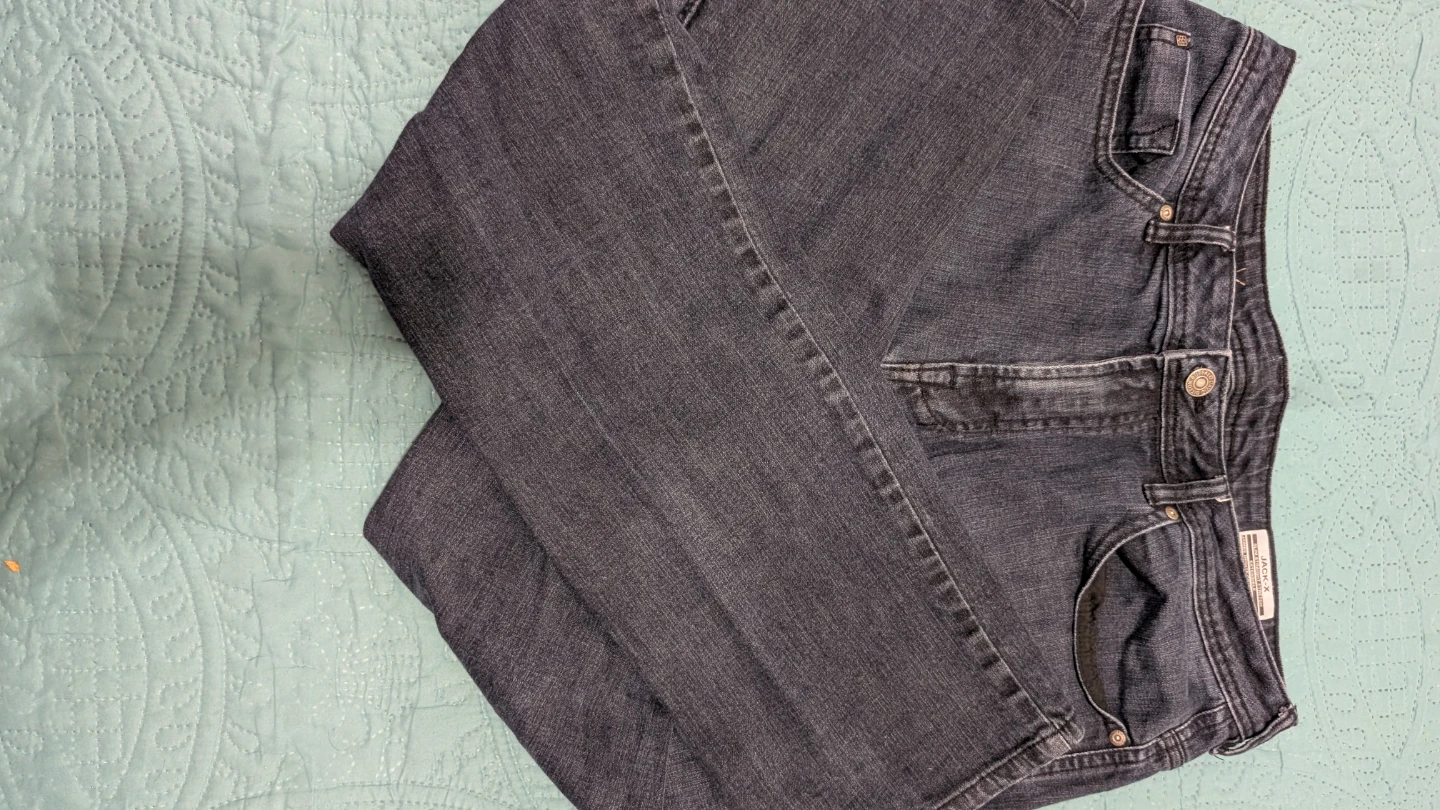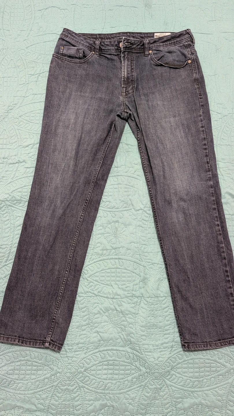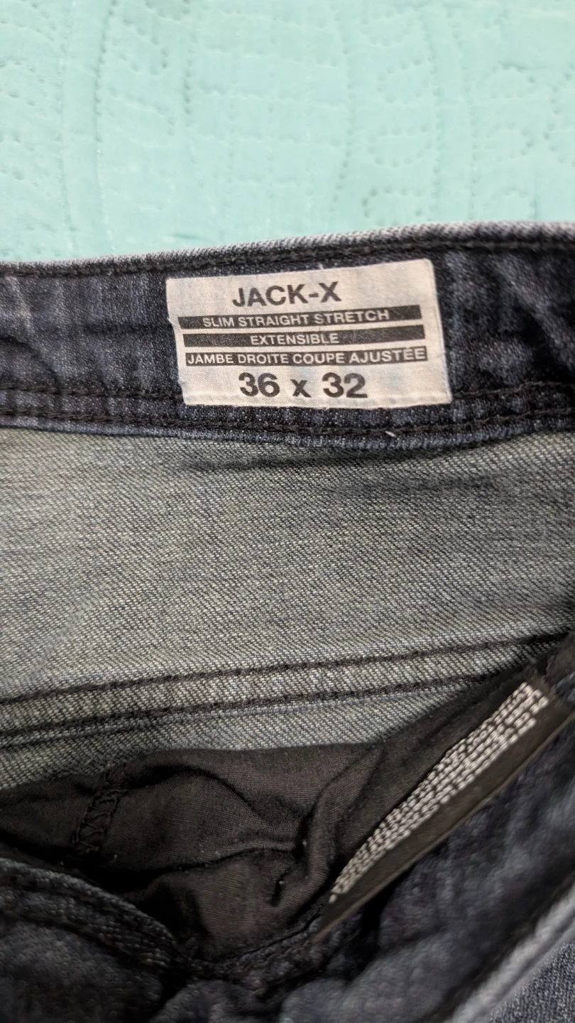 These are JACK & JONES JACK-X jeans in a slim straight stretch fit. Waist size is 36 inches and inseam is 32 inches. They're a dark wash denim. In very good condition.