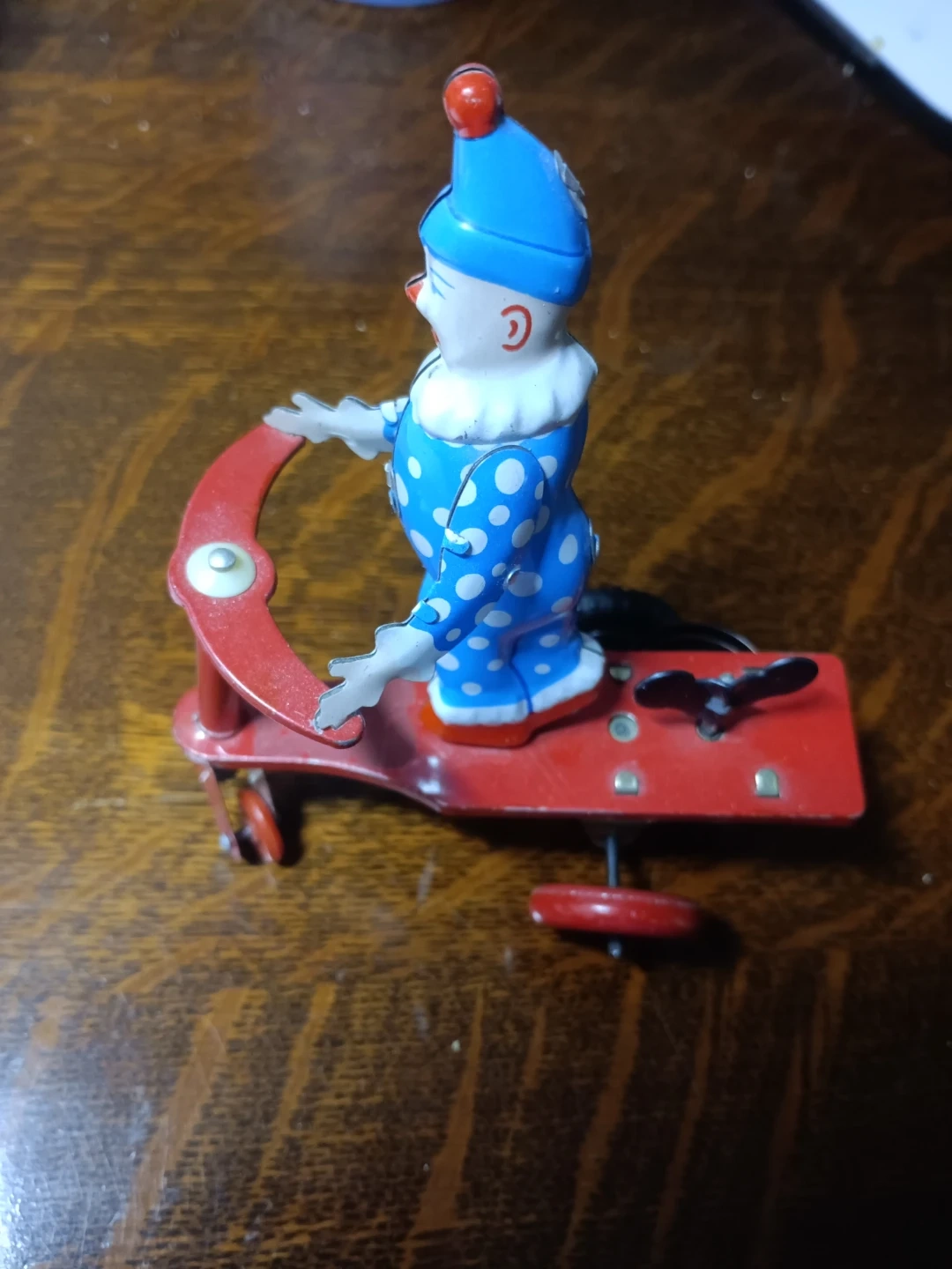 This is a vintage tin wind-up toy featuring a clown riding a scooter. It has a blue and white polka dot outfit and rides on red and black wheels. The wind-up mechanism is visible underneath. It's a classic collectible toy!