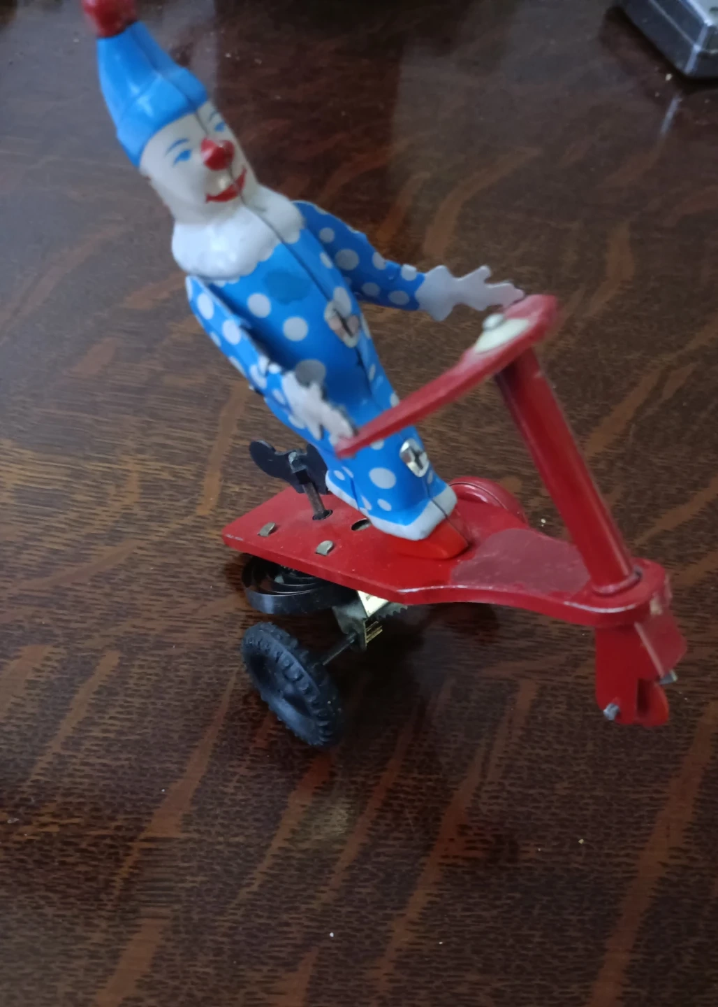 Vintage Tin Wind-Up Clown on Scooter Toy