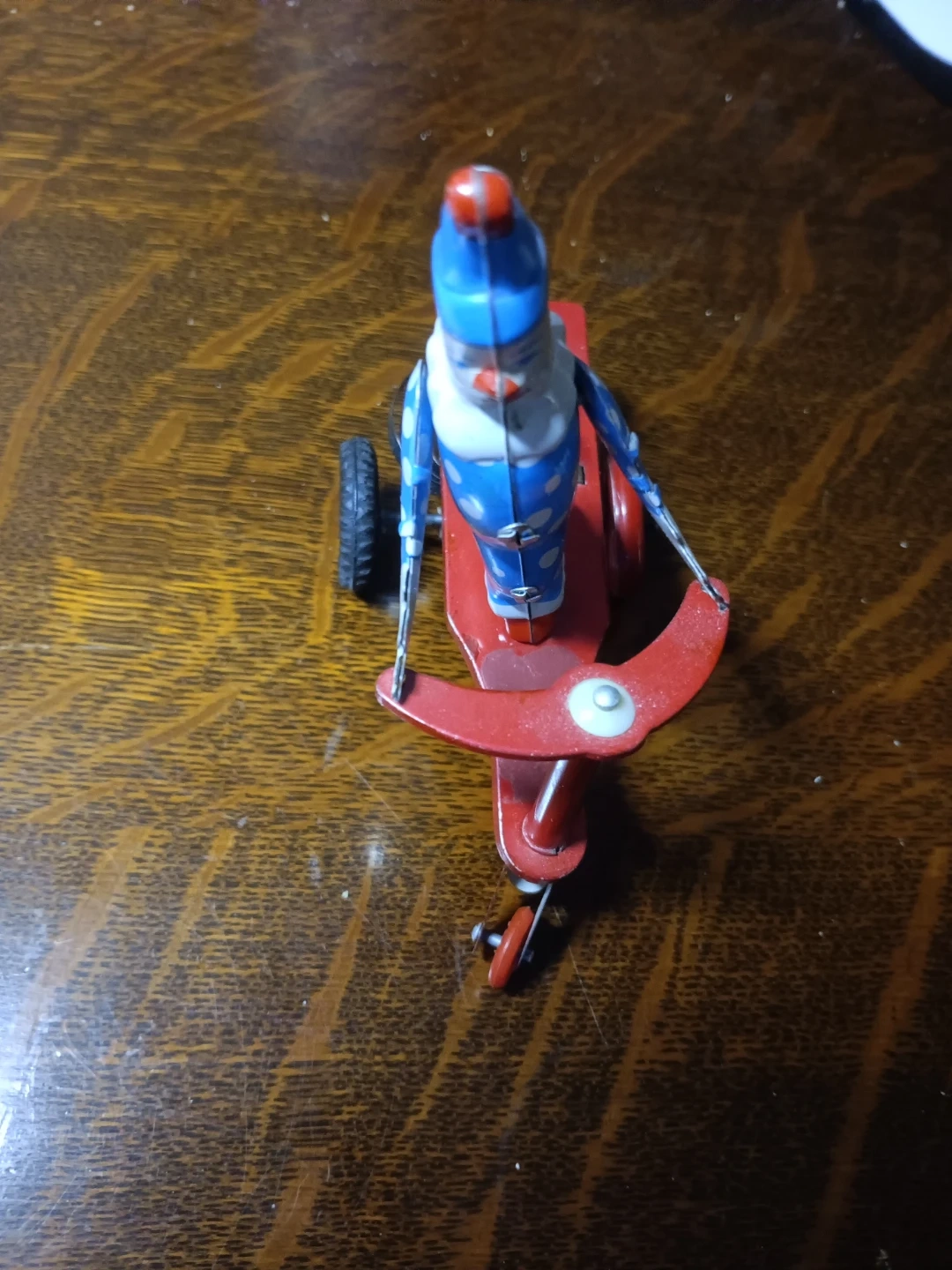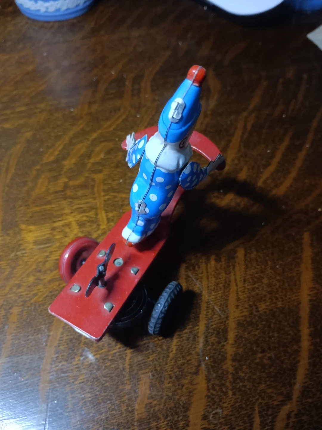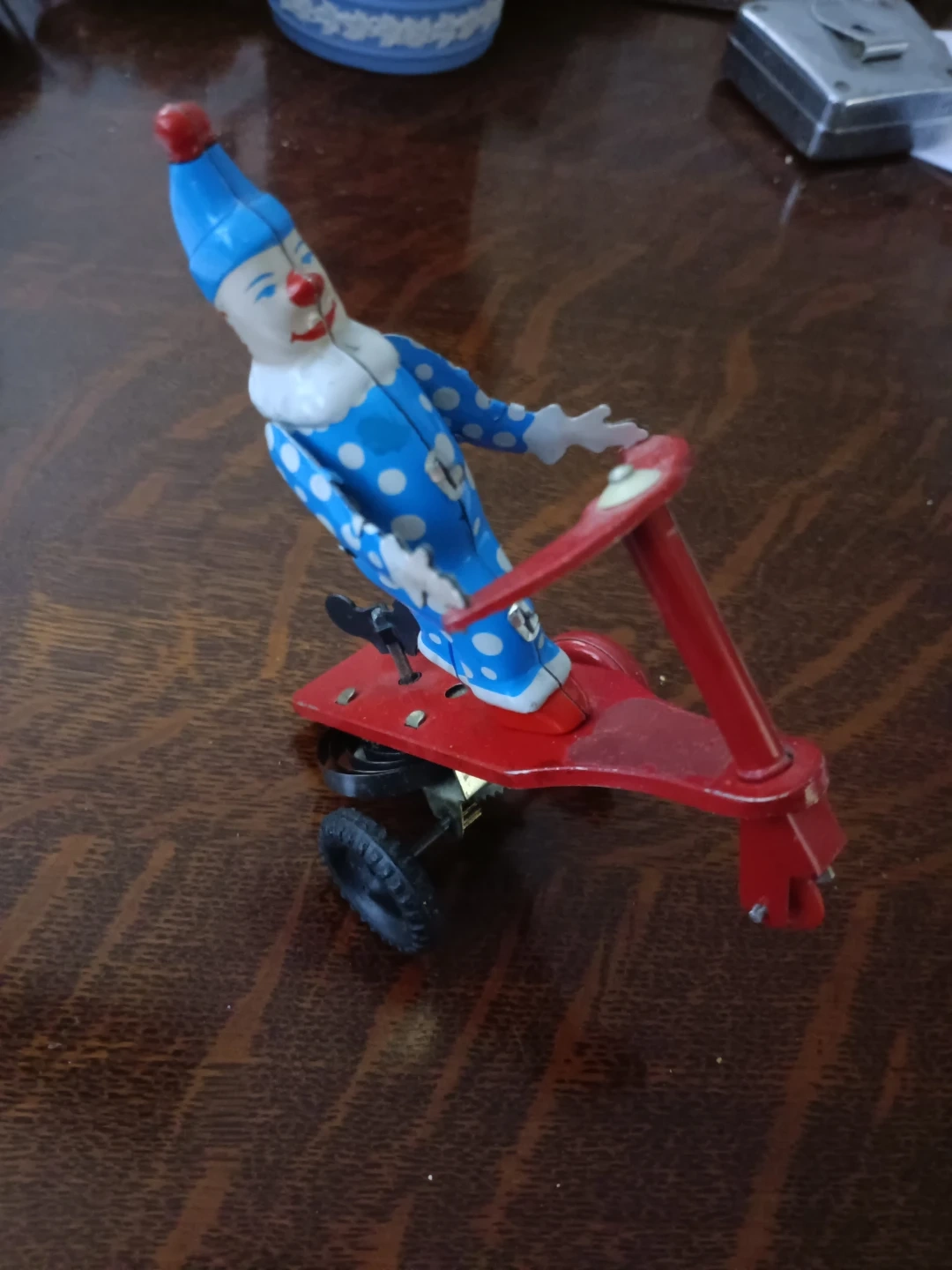 This is a vintage tin wind-up toy featuring a clown riding a scooter. It has a blue and white polka dot outfit and rides on red and black wheels. The wind-up mechanism is visible underneath. It's a classic collectible toy!