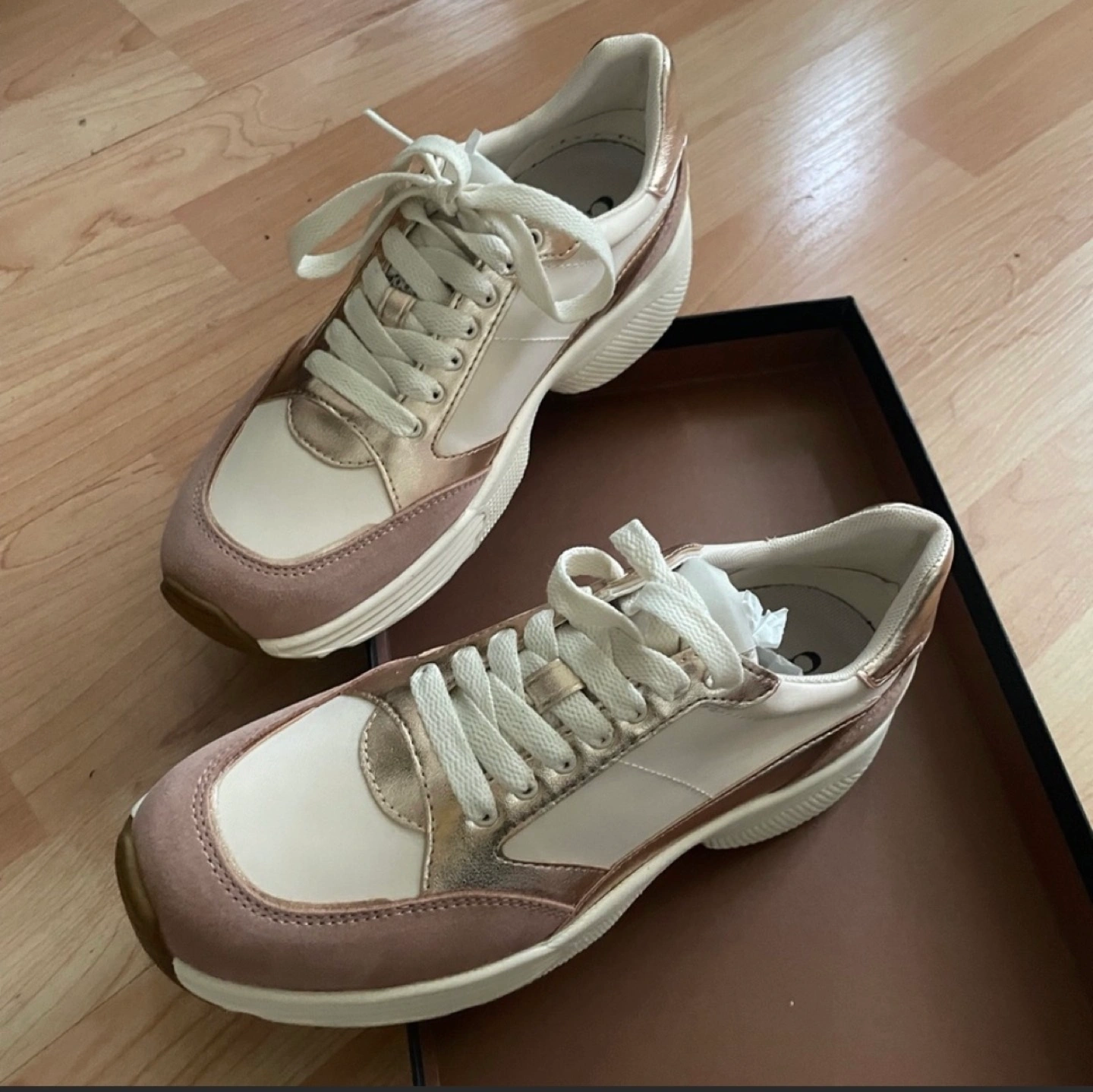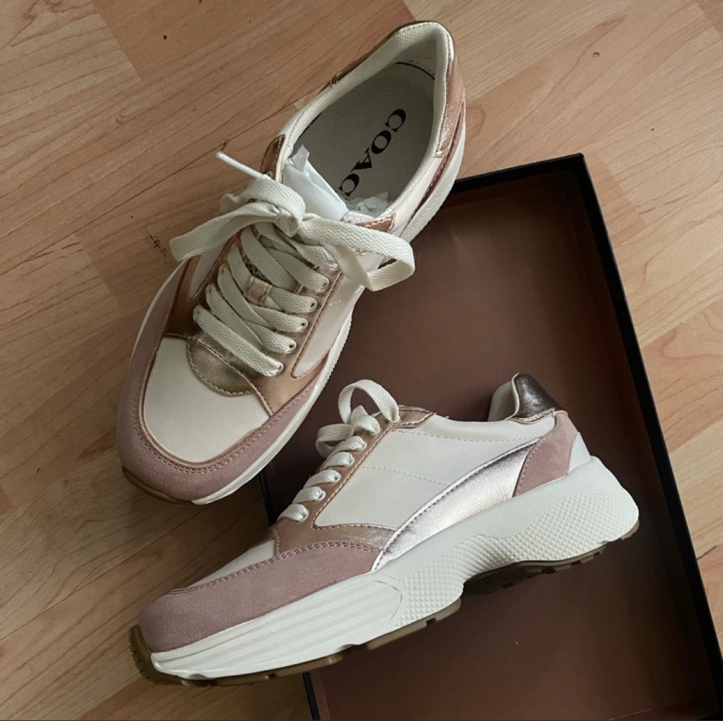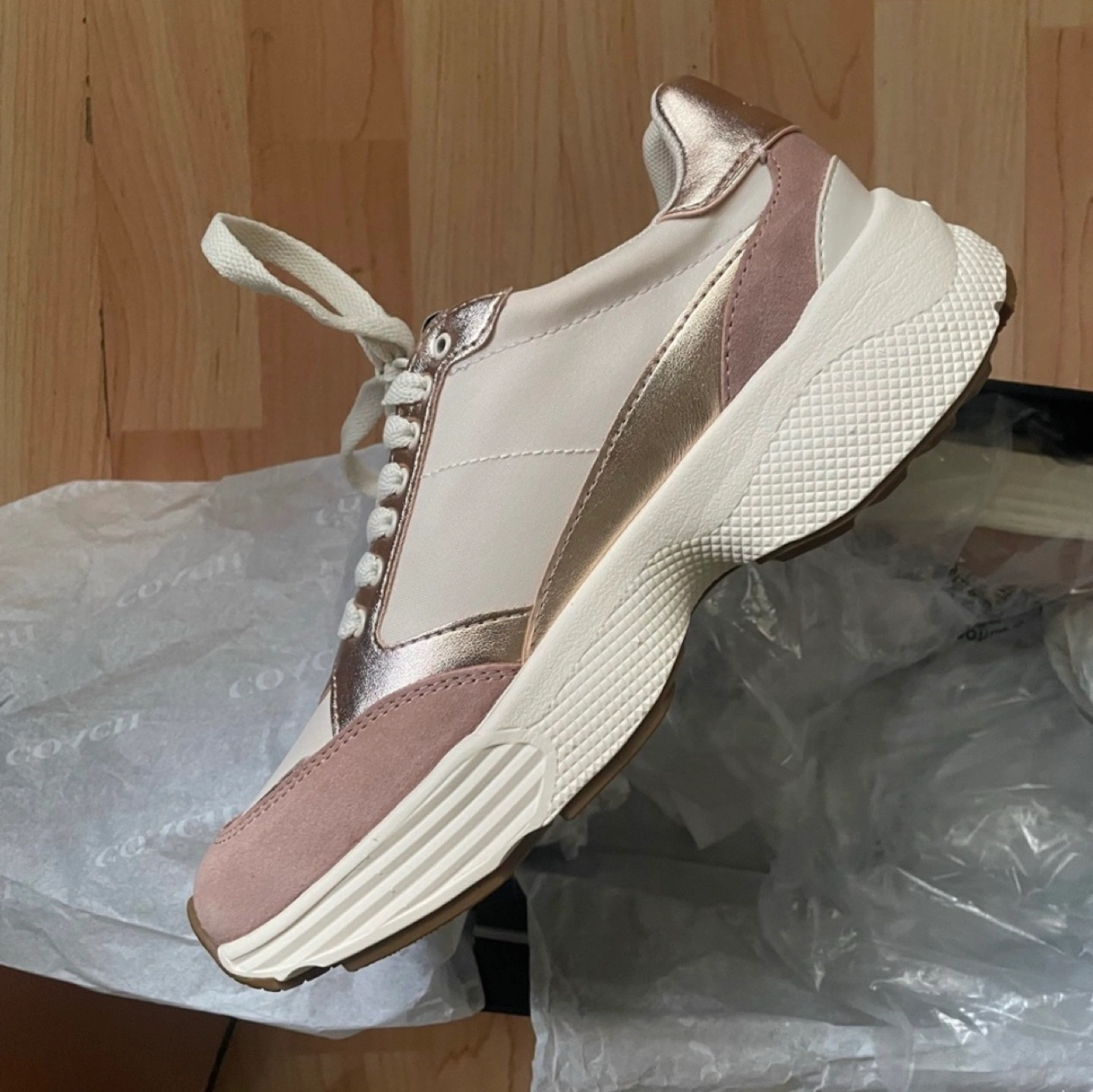 Blush, metallic and cream runner by coach. Canvas, leather and suede with a rubber outsole and lace-up closure. Never worn. Comes in original packaging.