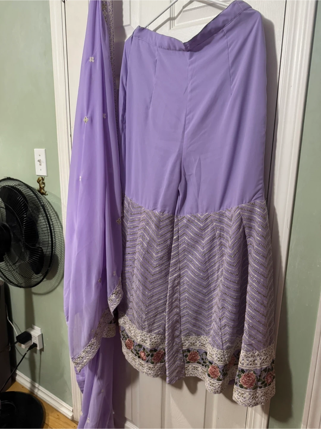 This is a lovely three-piece outfit for women. It features a purple kurti adorned with intricate silver sequin and beadwork in a chevron pattern, with embroidered floral detailing at the hem. Matching purple pants and a sheer dupatta are included. It's perfect for cultural events or festive occasions!