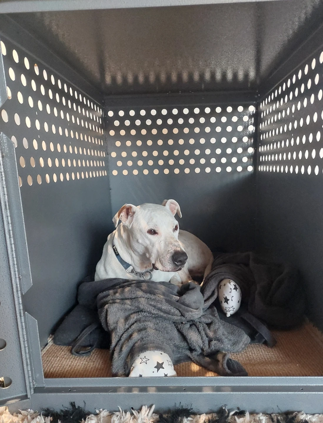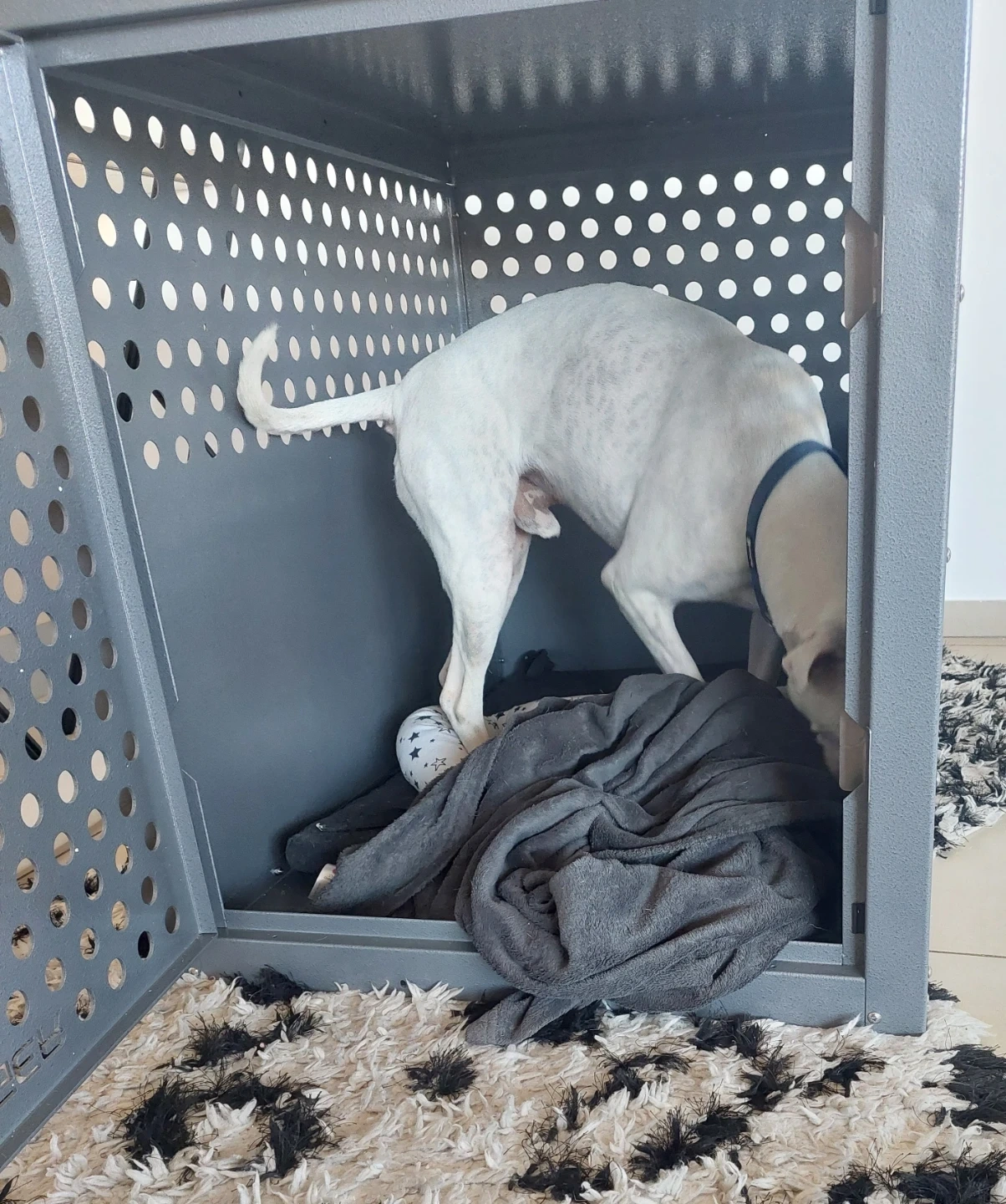Durable, airline approved metal dog crate with a secure latch. It's perfect for keeping your pet safe and comfortable. The crate has a spacious interior and good ventilation.