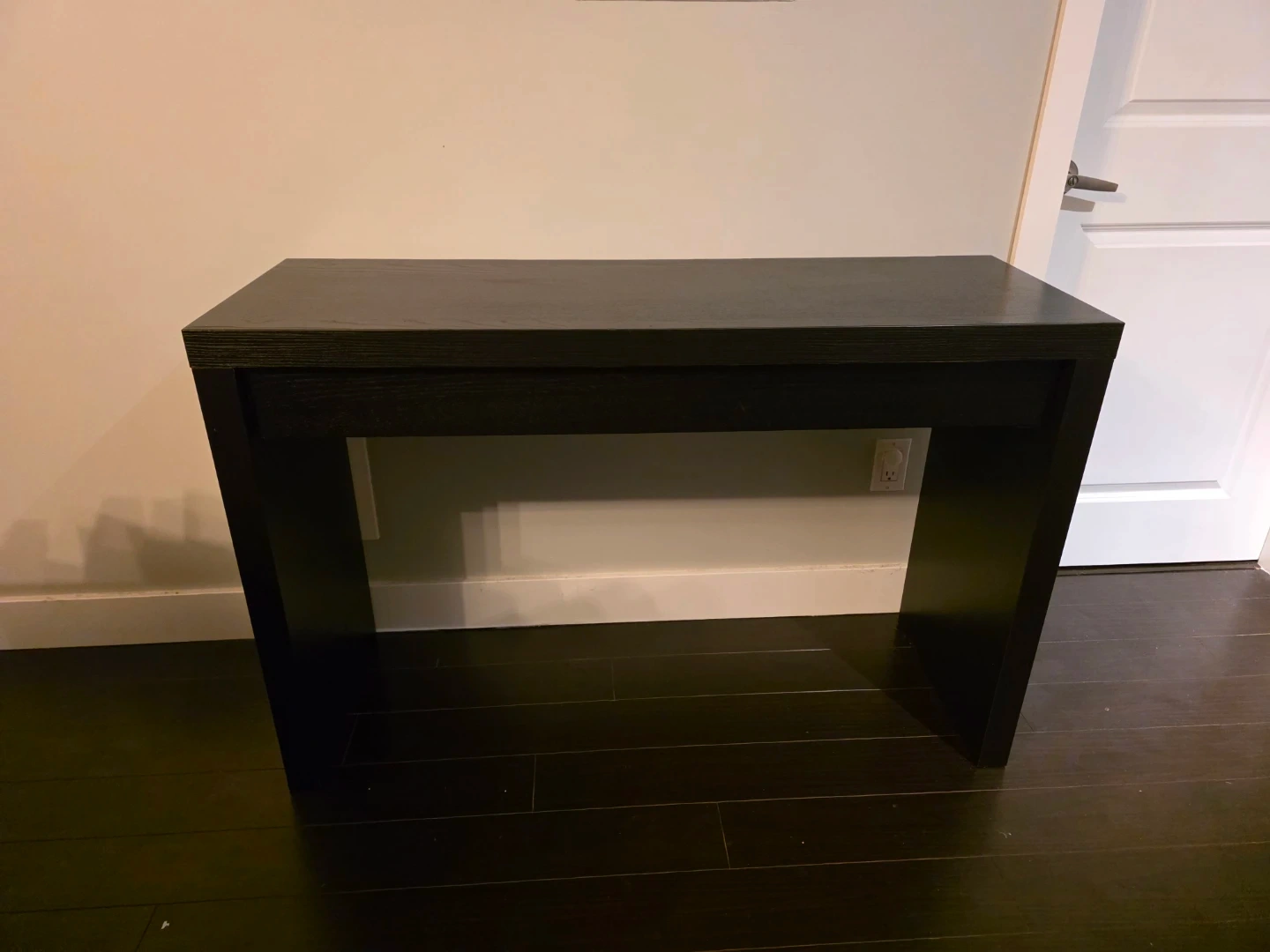 A sleek black console table with one drawer. It's perfect for entryways or narrow spaces. Wood construction.