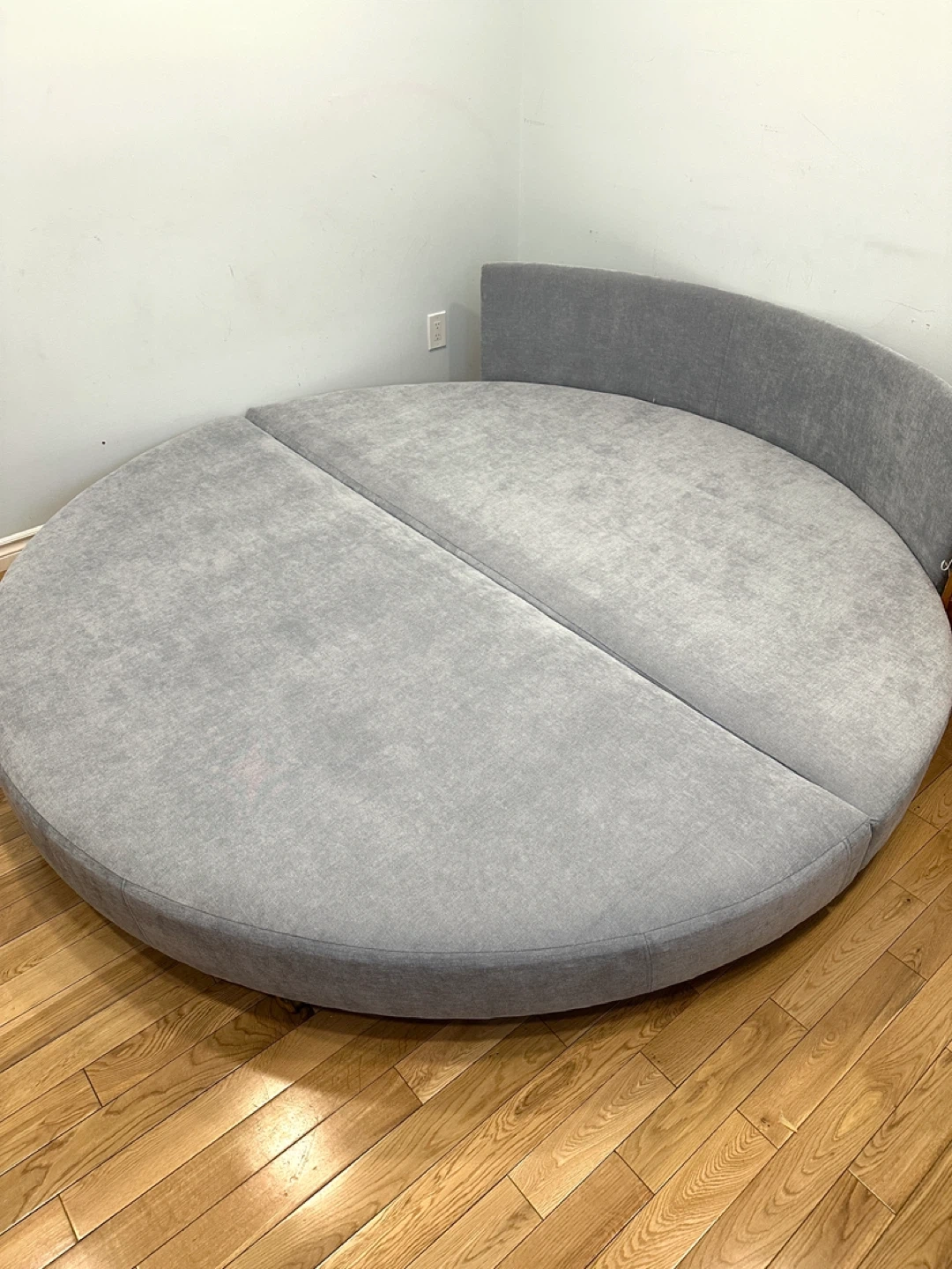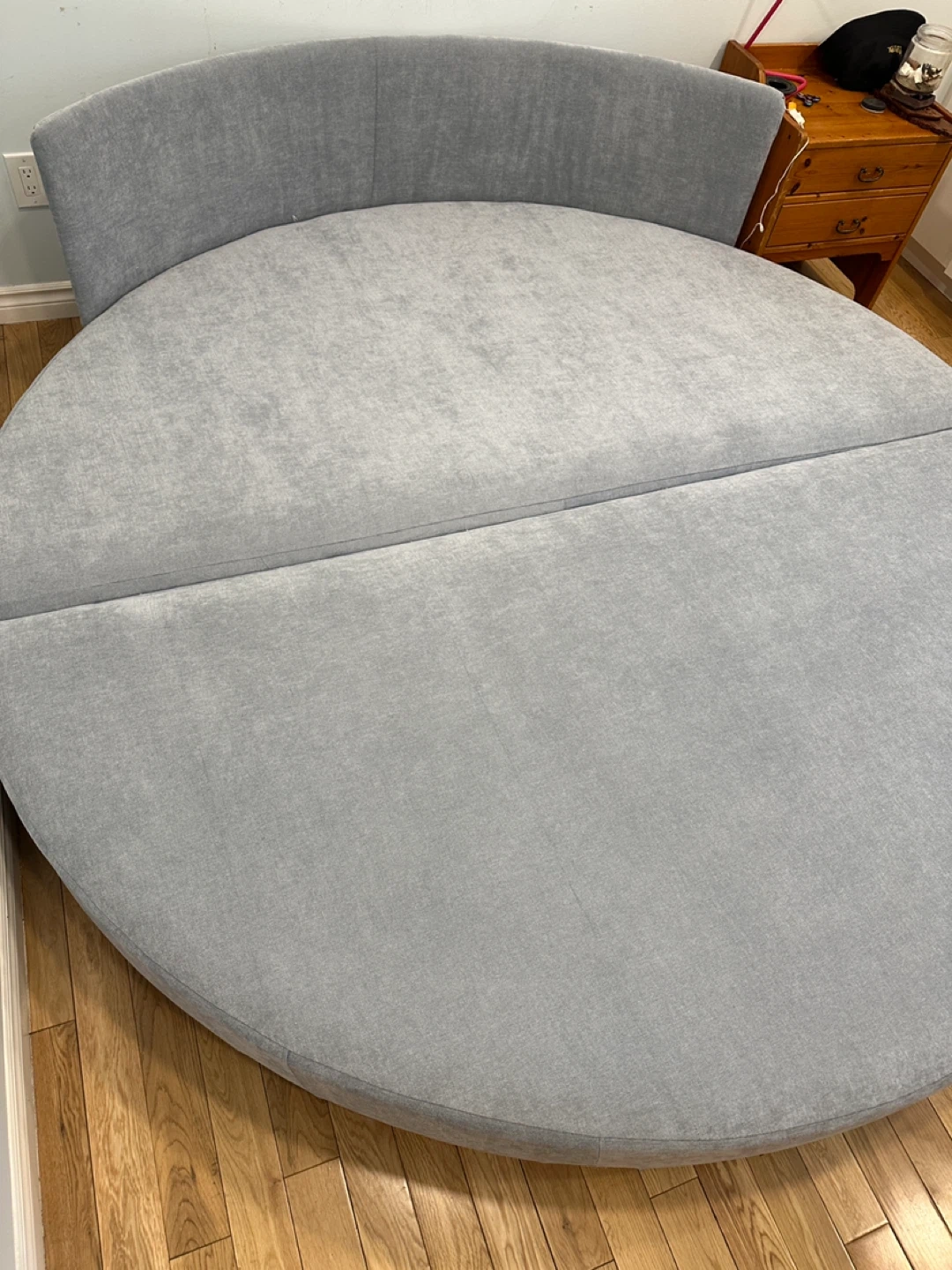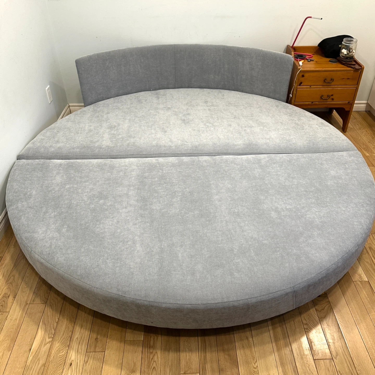 Unique vintage retro king Size round platform bed with a curved upholstered headboard. This eye-catching piece is perfect for anyone looking for a retro or statement bed for their bedroom.