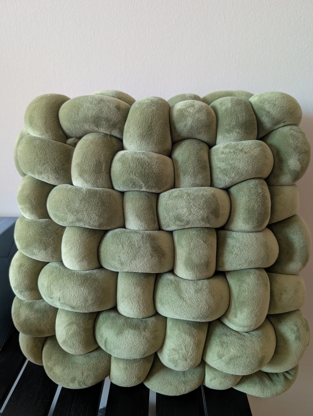 This decorative pillow features a soft, woven design in a sage green hue. Its unique braided construction adds a cozy texture to any living space. Plush and comfortable.