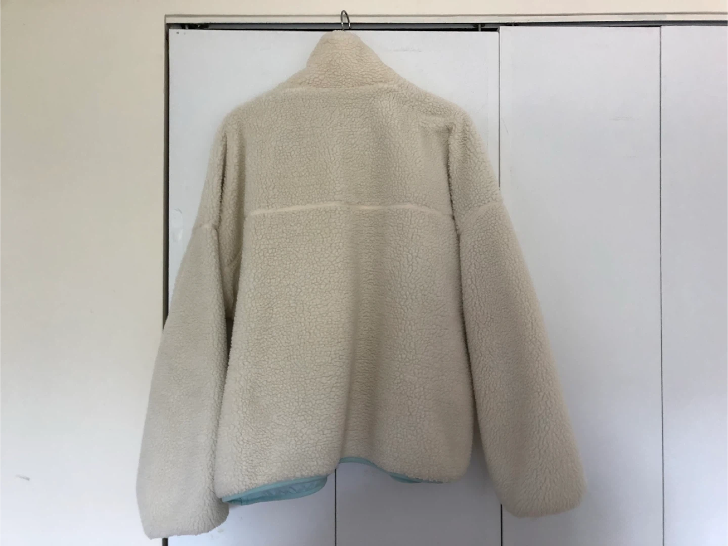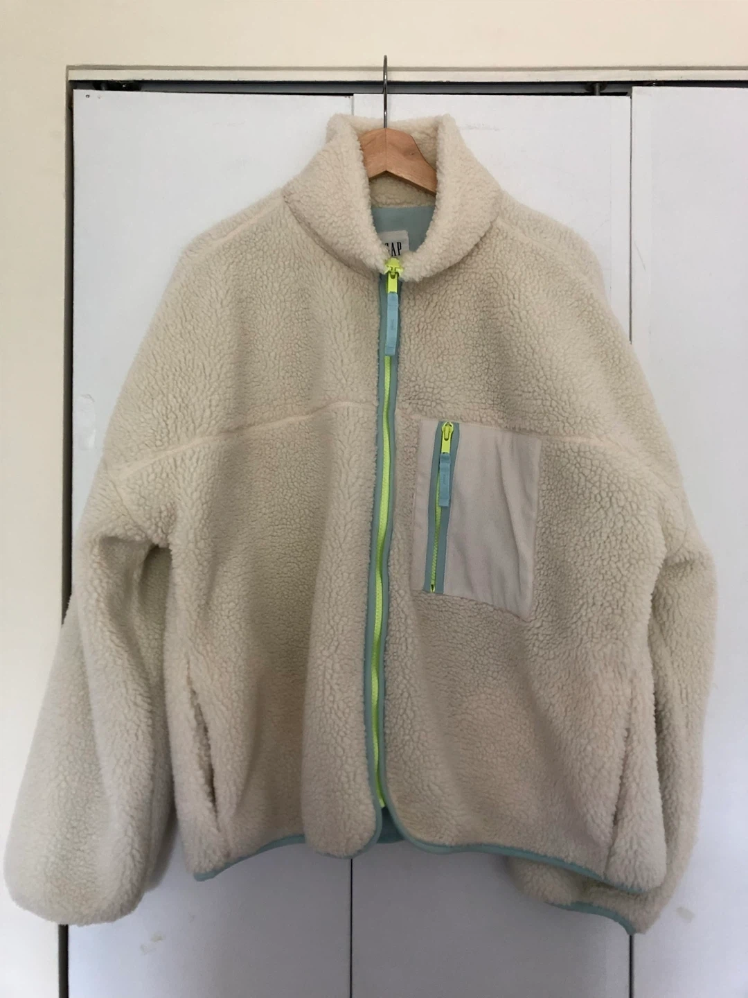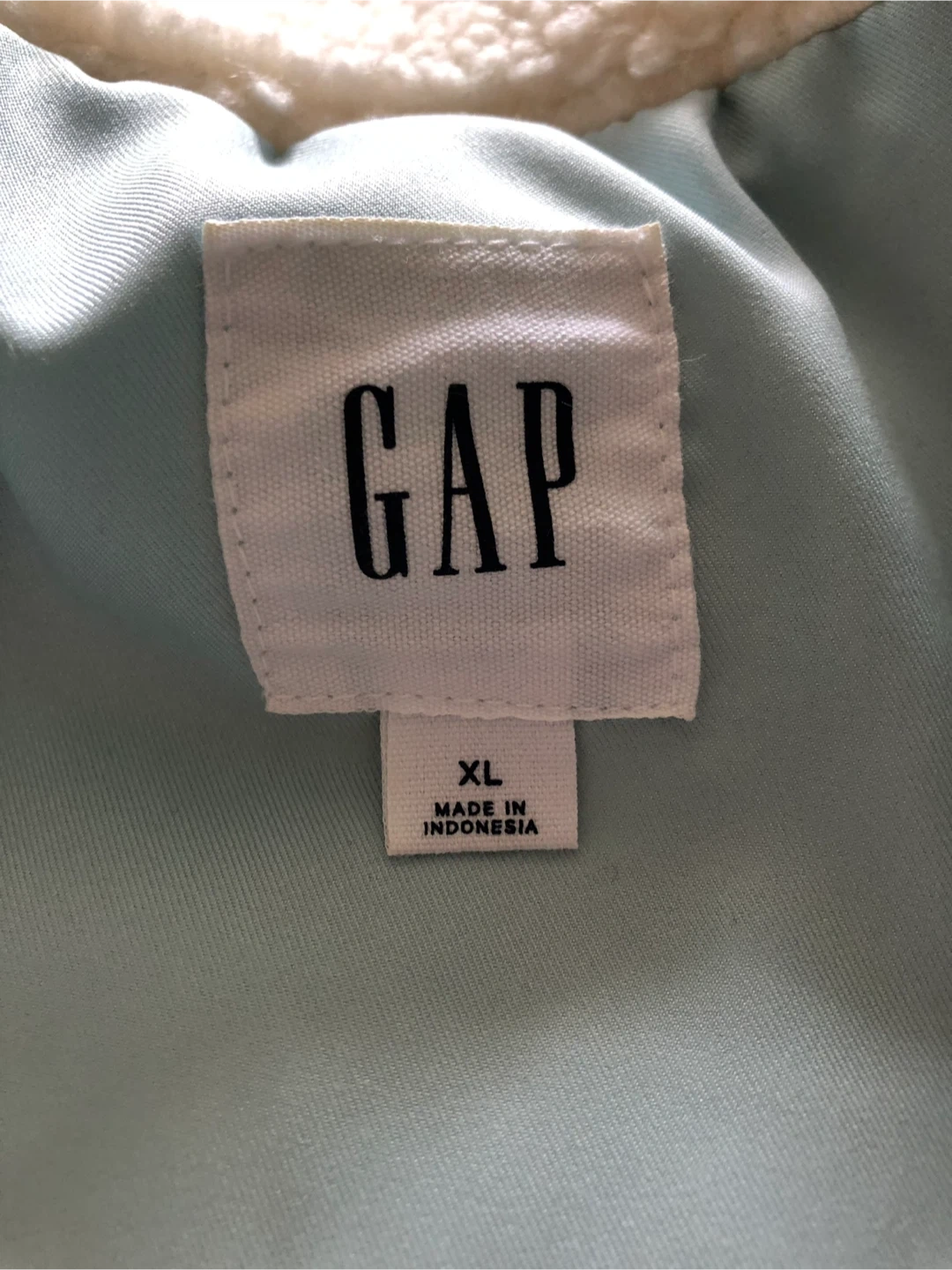 It's a size XL and features a soft, plush sherpa material. Perfect for staying warm and stylish!