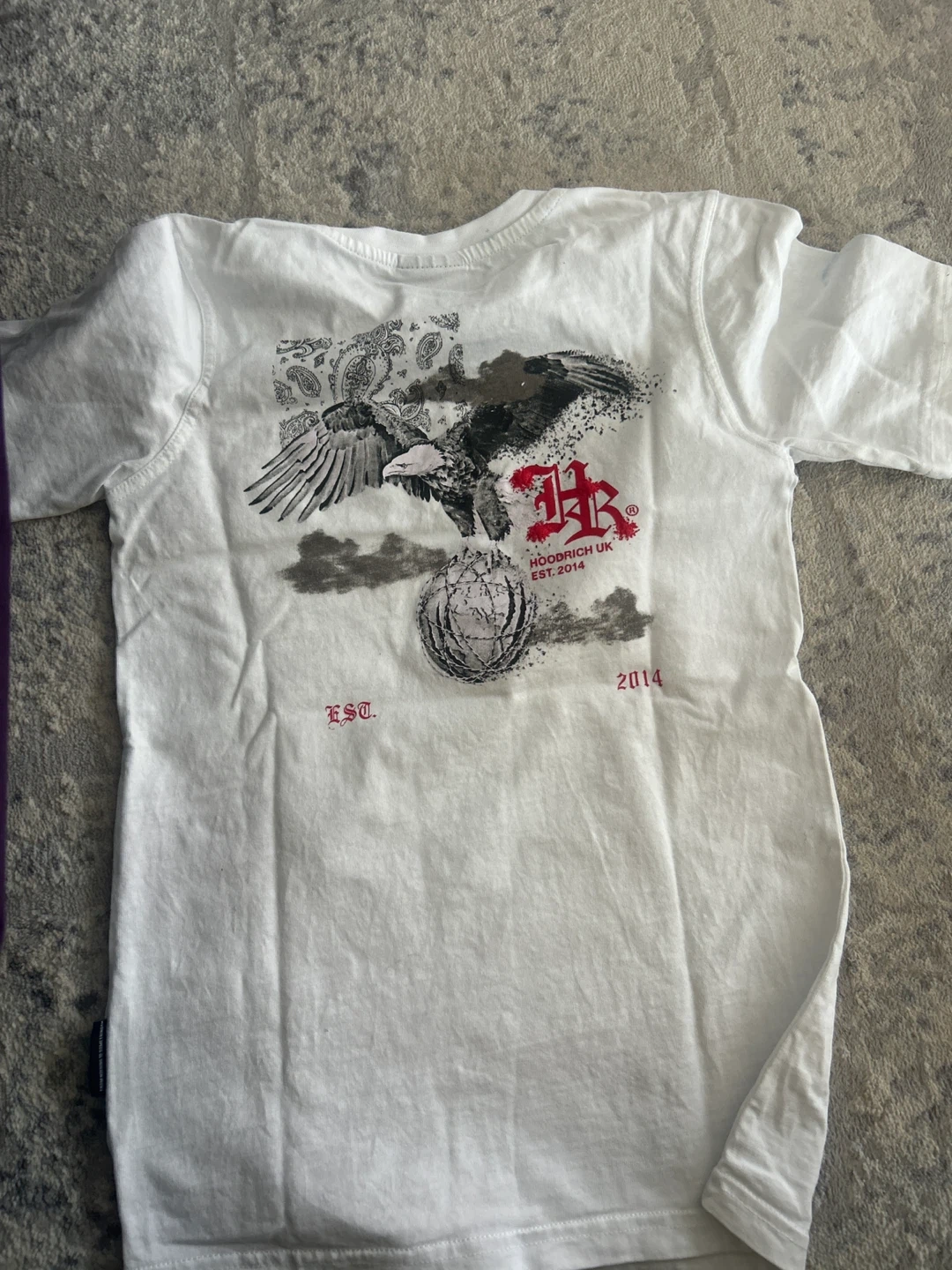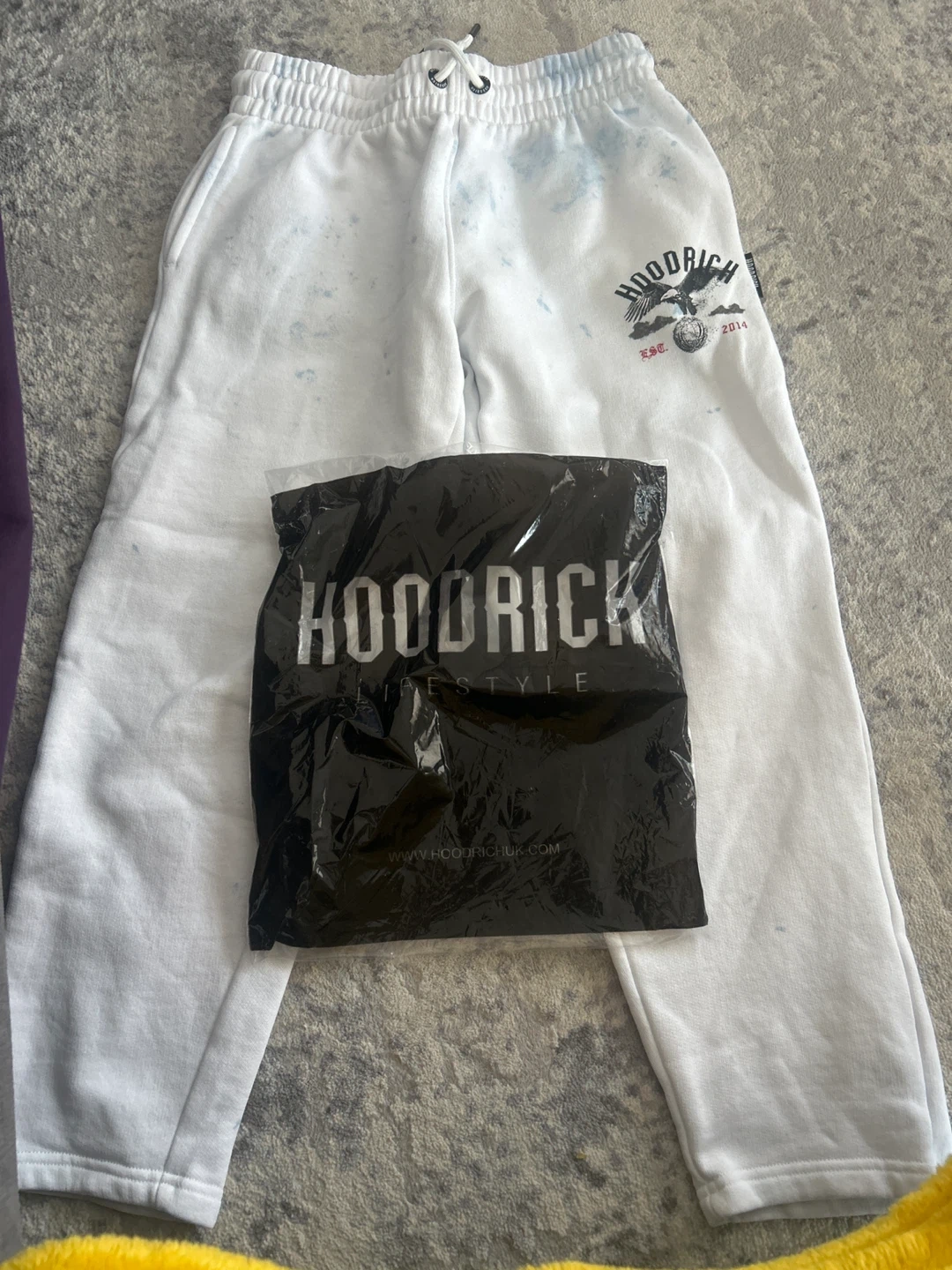 This is a white Hoodrich t-shirt and a pair of white joggers. The t-shirt has a graphic print of an eagle and globe on the back. The joggers also feature a graphic and branding. Both items are from Hoodrich UK.