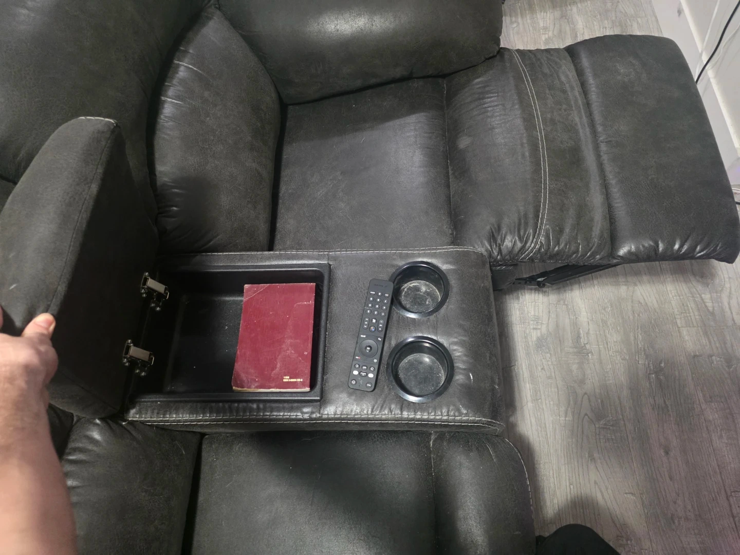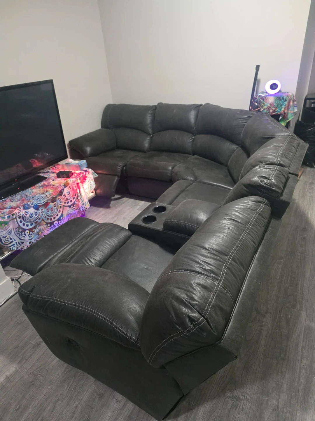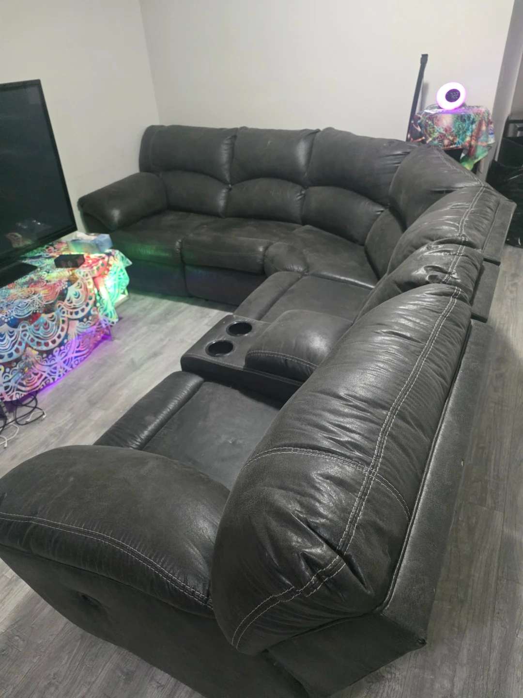 This sectional double recliner sofa is upholstered in a dark grey material with contrasting white stitching. It features multiple reclining seats, built-in cup holders, and a centre console with storage. The sofa offers ample seating and comfort for a living room space.