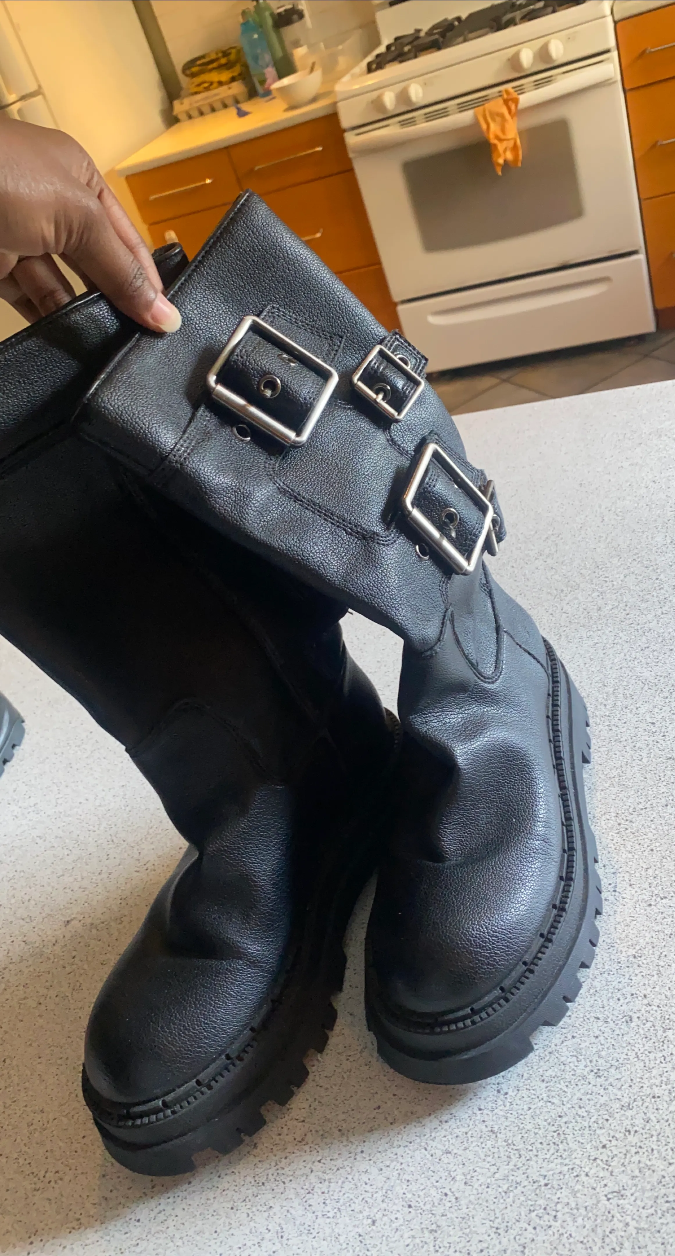 Selling a pair of Zara black leather boots. They feature a chunky sole and buckle detailing. Great for adding a bit of edge to any outfit!