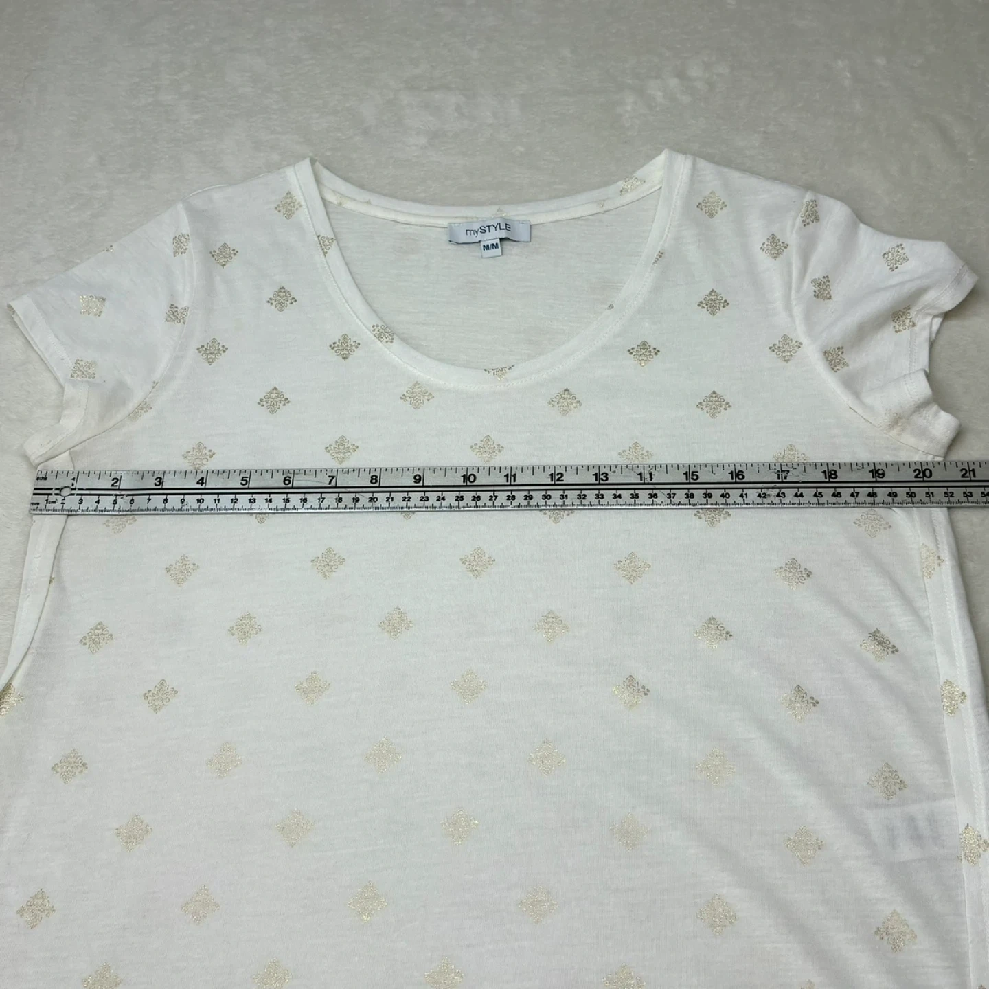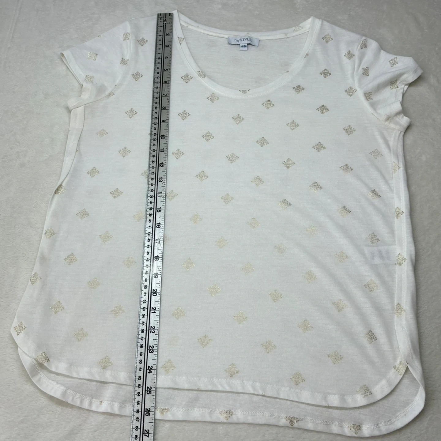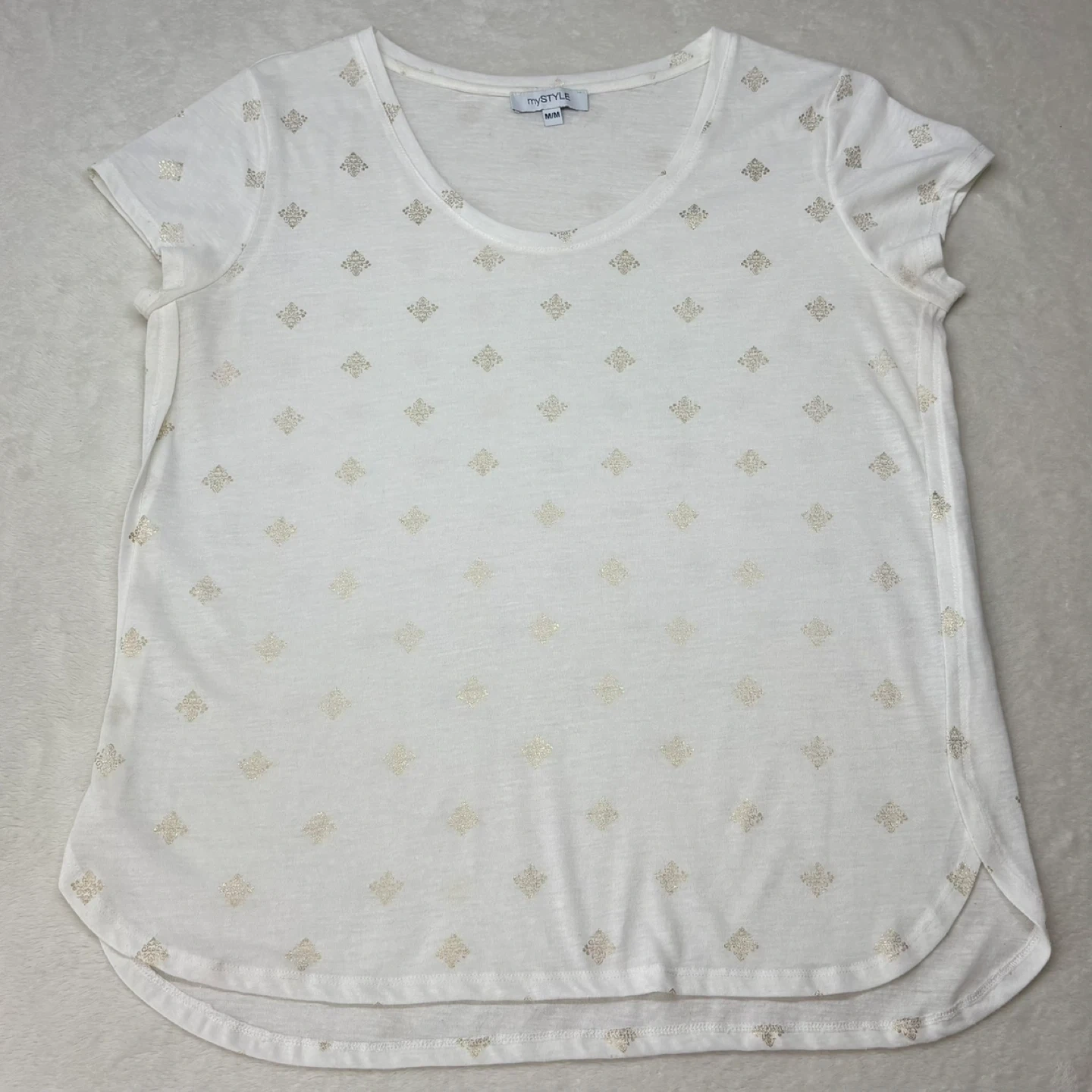 Lightweight and airy white t-shirt featuring an all-over gold foil metallic medallion print. This top offers a comfortable relaxed fit with a flattering scoop neck and high-low curved hem. Crafted from a soft breathable polyester and linen blend perfect for warm weather styling.