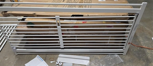 New, all components included. This extra tall and wide gate is 61.02 inches high, effectively preventing cats from jumping over. The ultra-narrow spacing (1.37") prevents pets or kids from getting through or stuck. Includes two densification rods for wider gaps. The lock system is conveniently located in the middle and allows the gate to open in both directions, staying open at 90° and auto-closing when less than that. Easy for adults to open with one hand but difficult for children. Features an upgraded thicker pipe wall for stability. Pickup is near Kipling and Evans.