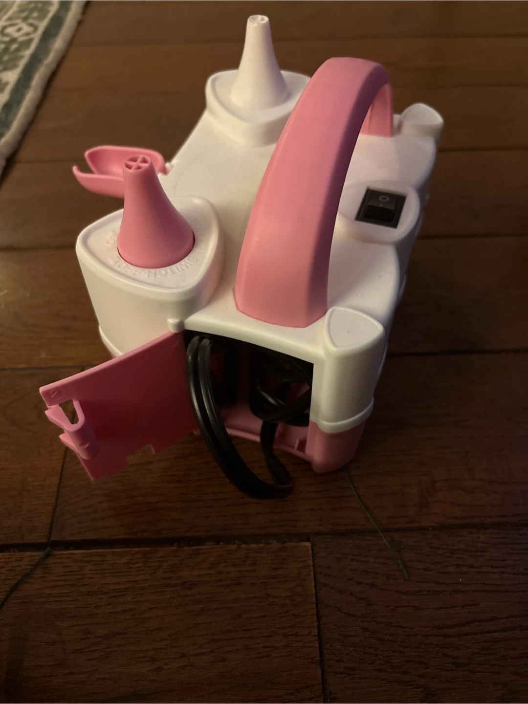 This portable electric balloon pump inflator makes decorating for parties a breeze! It's designed with two nozzles for quick inflation. The unit includes a convenient storage compartment for the power cord.