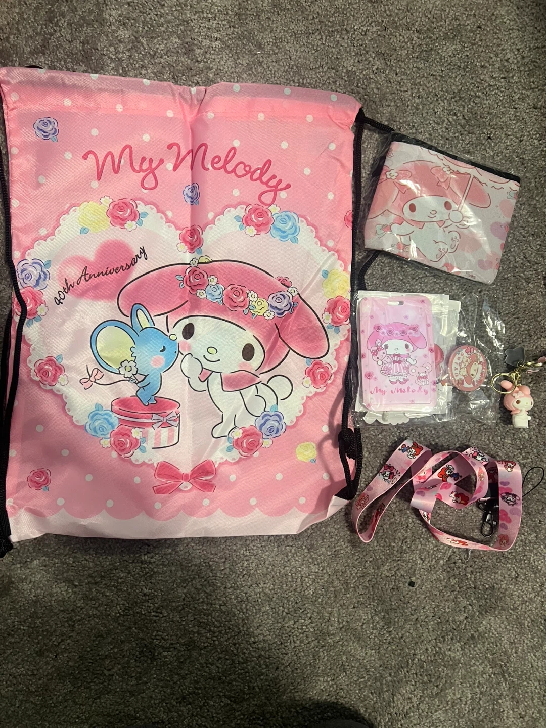 This set features a pink My Melody drawstring bag with floral accents. It also includes a matching coin purse and lanyard with charms. Perfect for fans of Sanrio!