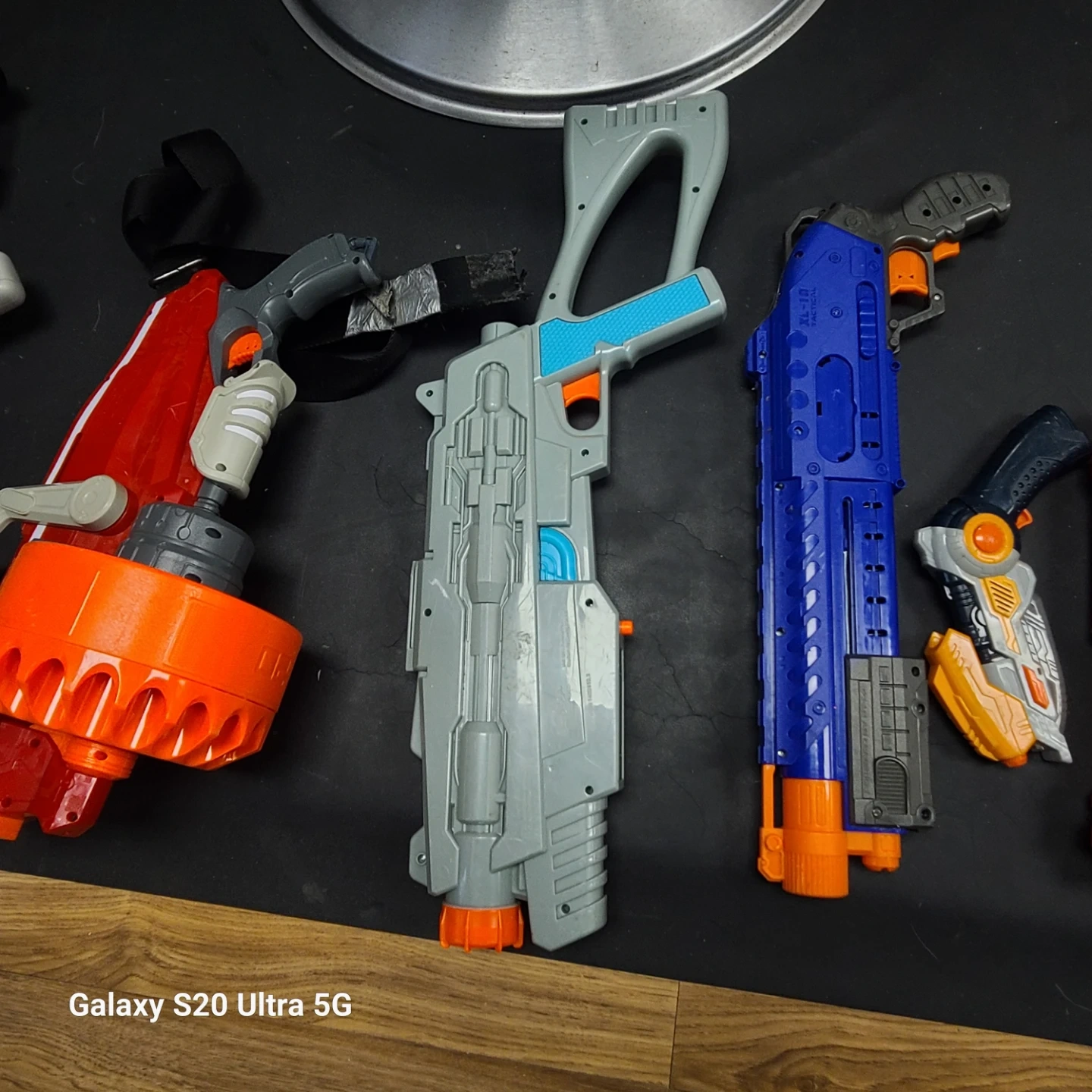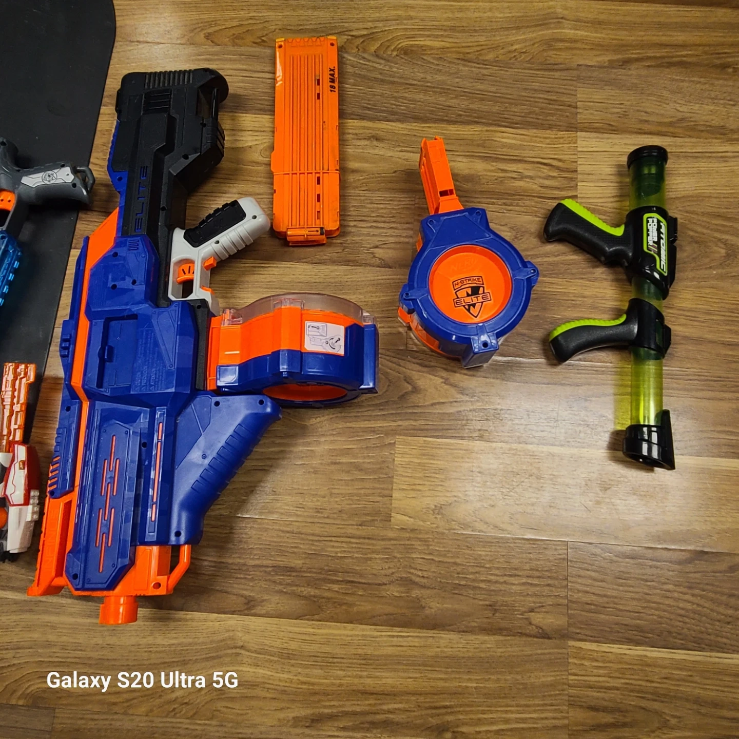 Collection of assorted Nerf blasters and accessories. Includes multiple blasters, drum magazines, and a large capacity magazine.
