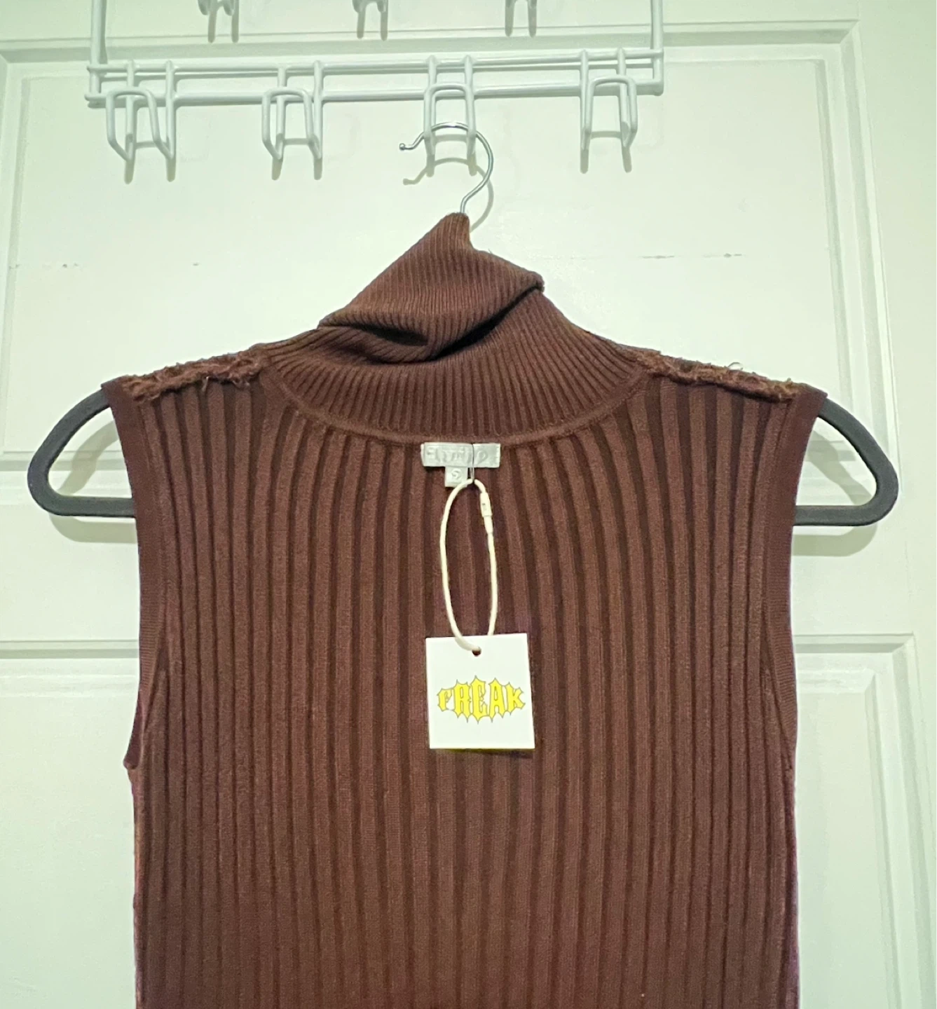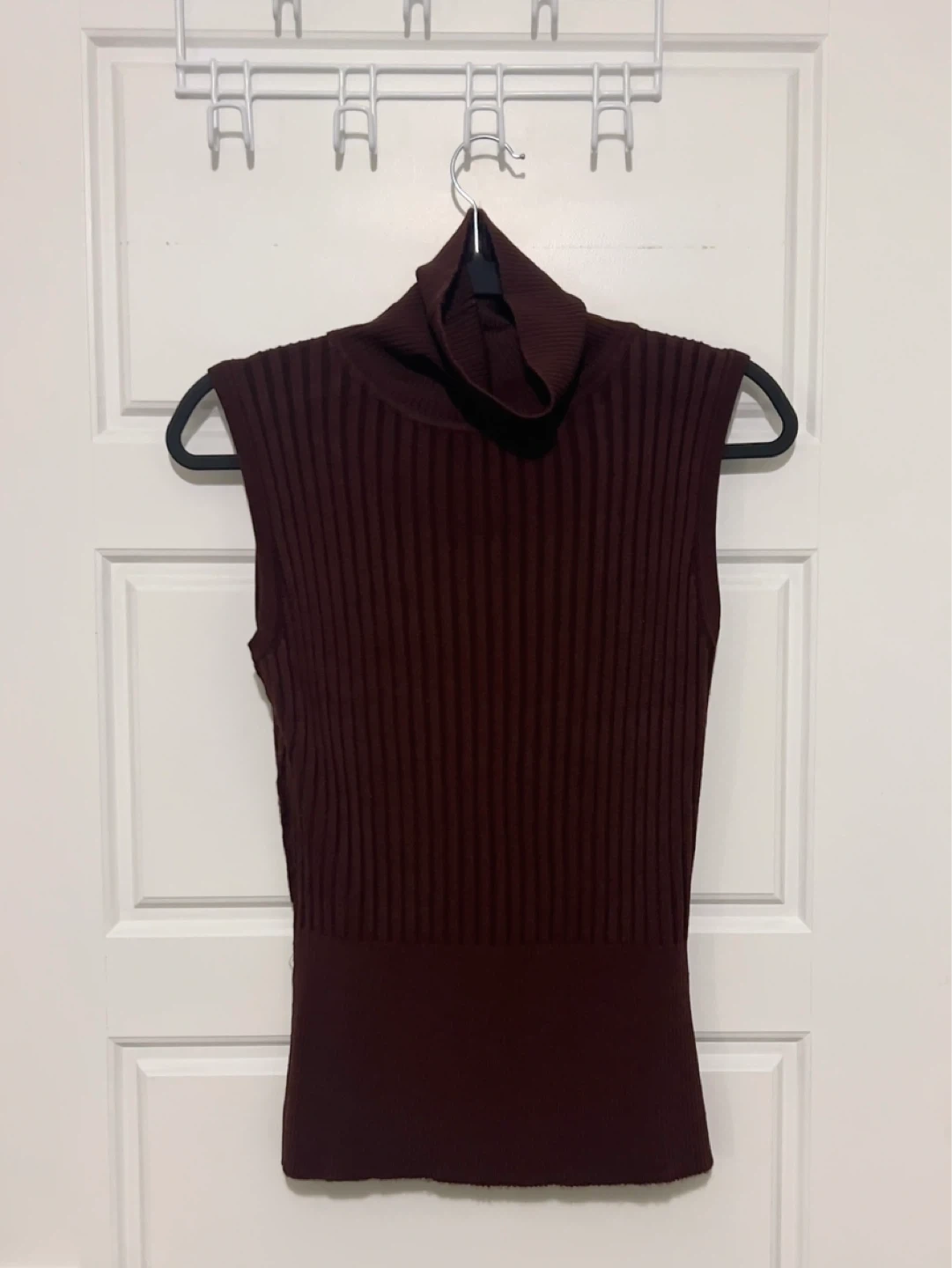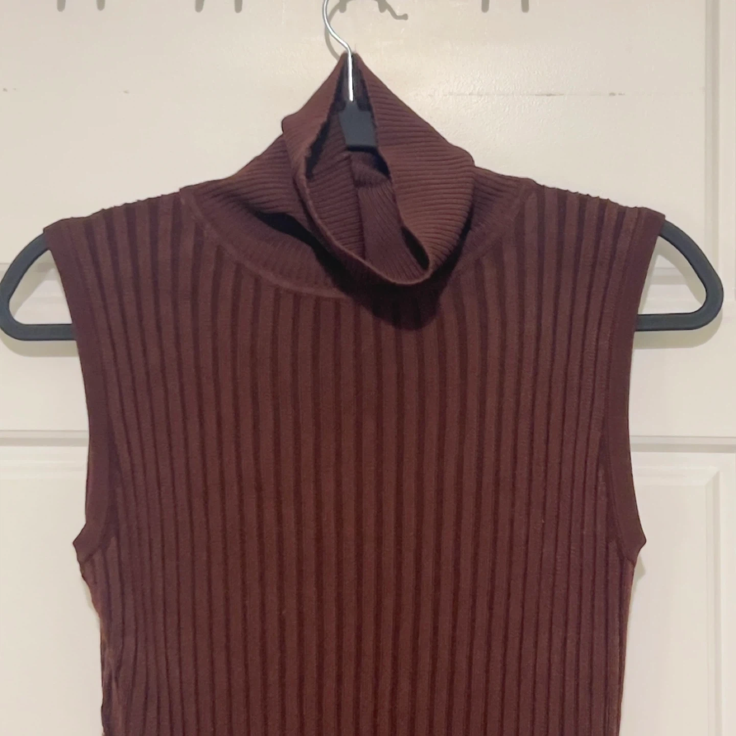 A sleeveless turtleneck top in a rich brown colour. It's made of a ribbed stretchy knit material. Perfect for layering or wearing on its own!